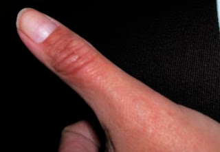 För några dagar sedan när jag skulle vara duktig och laga middag till Micke o Fredrik prickade jag inte riktigt rätt och hällde 100 gradigt vatten över min tumme istället för i en kopp som det var tänkt. Det gjorde ganska ont kan man säga och jag var något röd. Men nu, 5 dagar senare, ser min tumme ut såhär. Jag undrar vad som håller på att hända? Byter jag skinn, håller jag på att bli en reptil eller kommer jag få bära en 90 årings hud på tummen resten av livet? Det är allt annat än snyggt men som tur är så är Sala så kallt nu att vantar är nödvändigt.