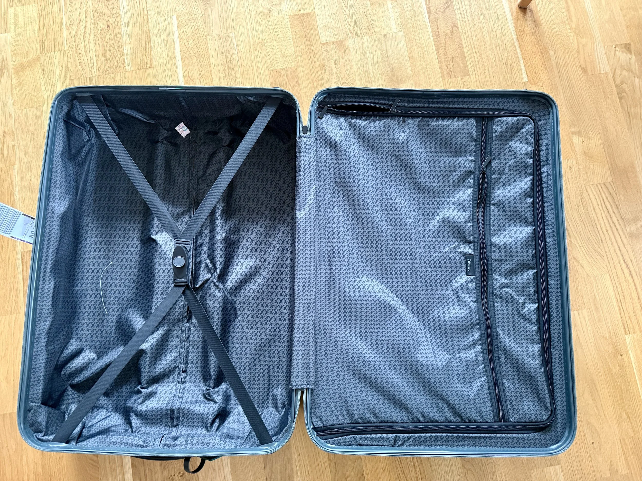 Väskan är superlätt när den är tom och gjord av tålig polykarbonat. På insidan har du ett fack som går att stänga igen, och på andra sidan finns ett perfekt utrymme för kläder med ett elastiskt kryssband som håller allt på plats. Handtaget är justerbart i flera nivåer och det finns fyra hjul med bra rull som också klarade av tung vikt
