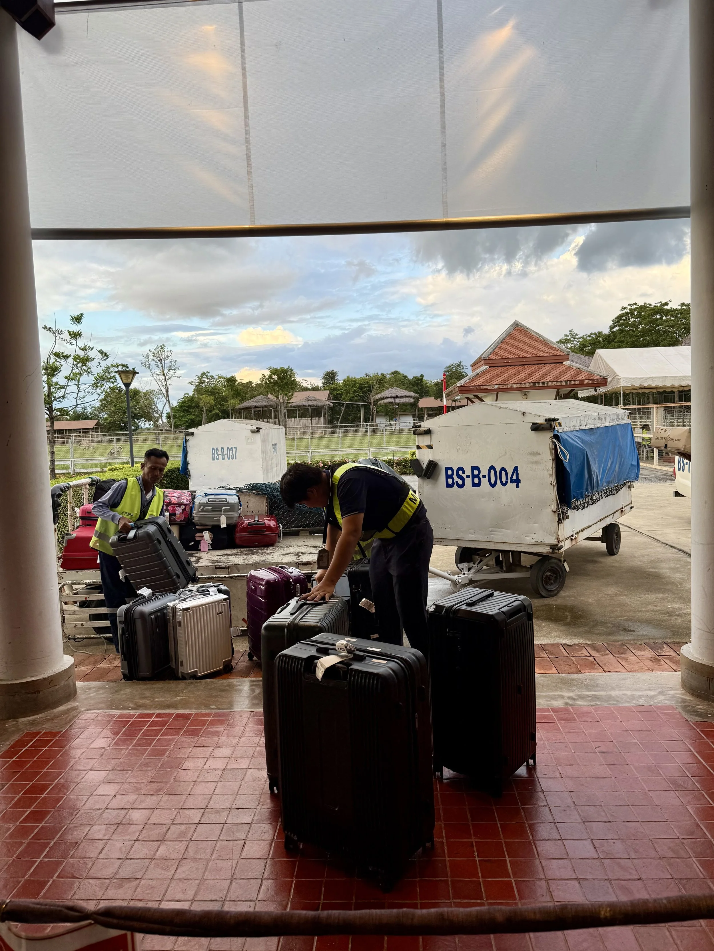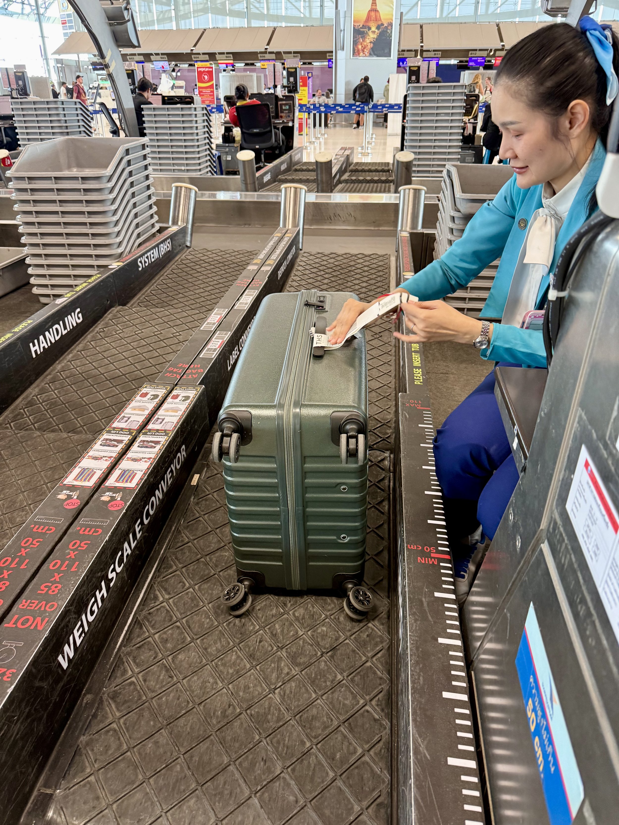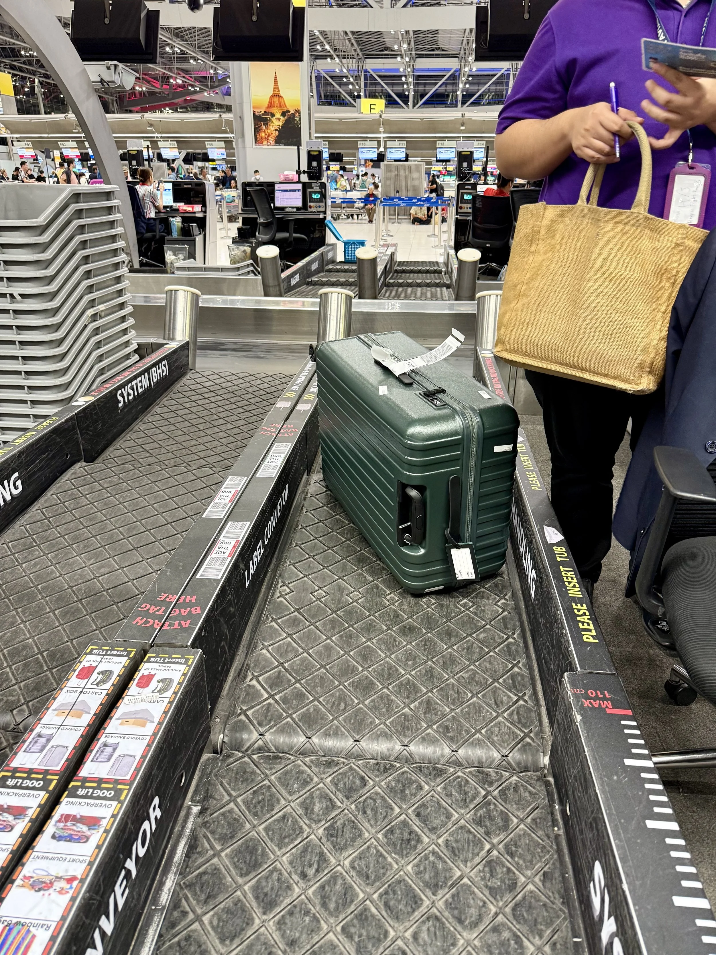 Jag reste Stockholm - Bangkok - Sukothai - Bangkok - Stockholm och min väska har inte en skråma. Det var verkligen inga problem att checka in väskan, allt flöt på smidigt, och när jag kom fram var den superenkel att känna igen på bagagebandet eftersom den sticker ut direkt bland alla svarta väskor. (Eller som på sista bilden, avlastning av väskor på Suokthais lilla flygplats).