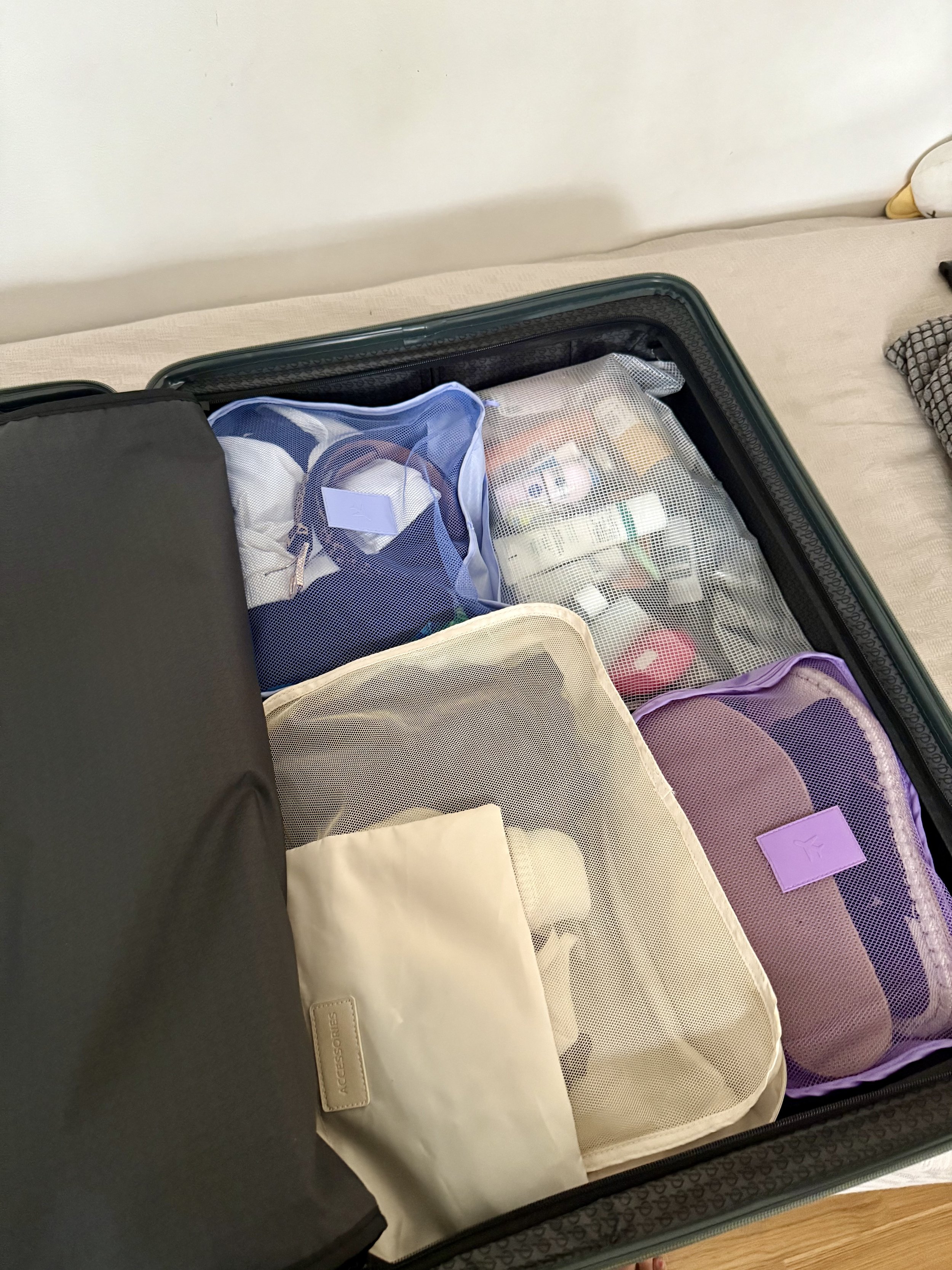 Jag packar alltid med packningskuber, för det gör det så mycket enklare att ha koll på allt i väskan, och det får det plats många i denna väska — som ni ser här. Det blir liksom ordning på sakerna direkt och jag slipper rota runt och leta efter saker varje gång jag öppnar väskan.