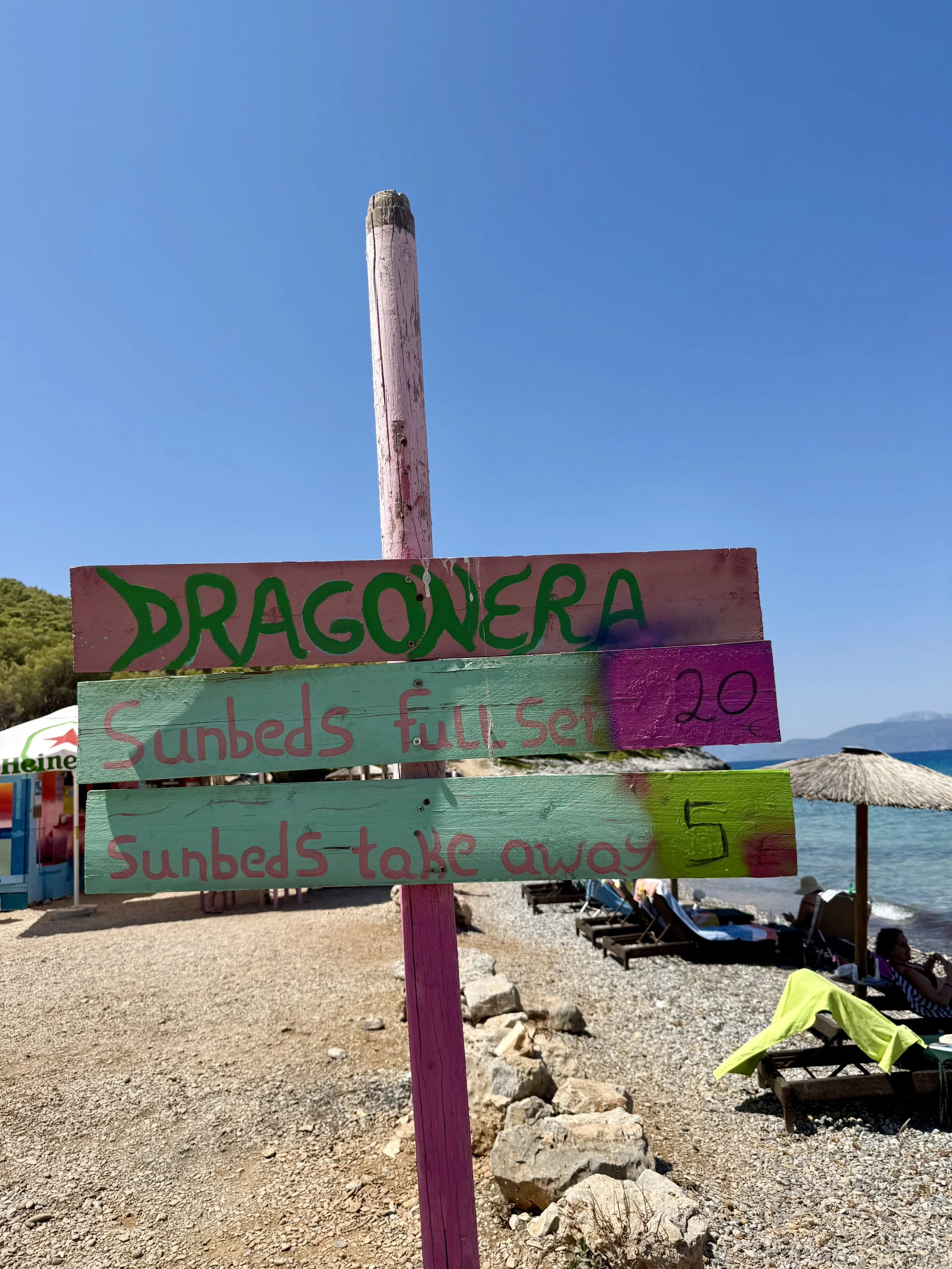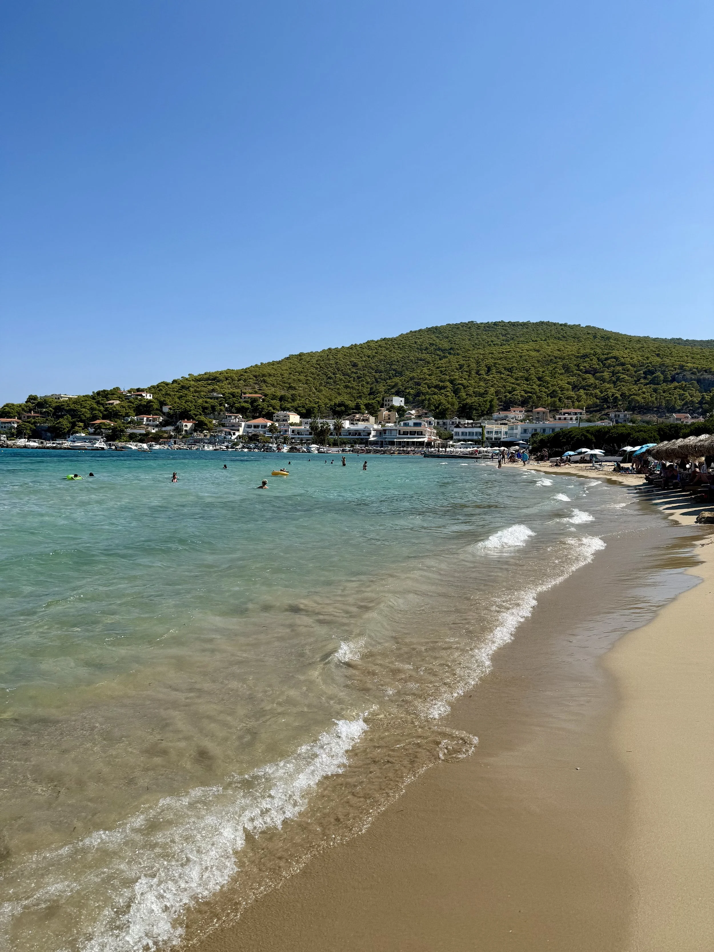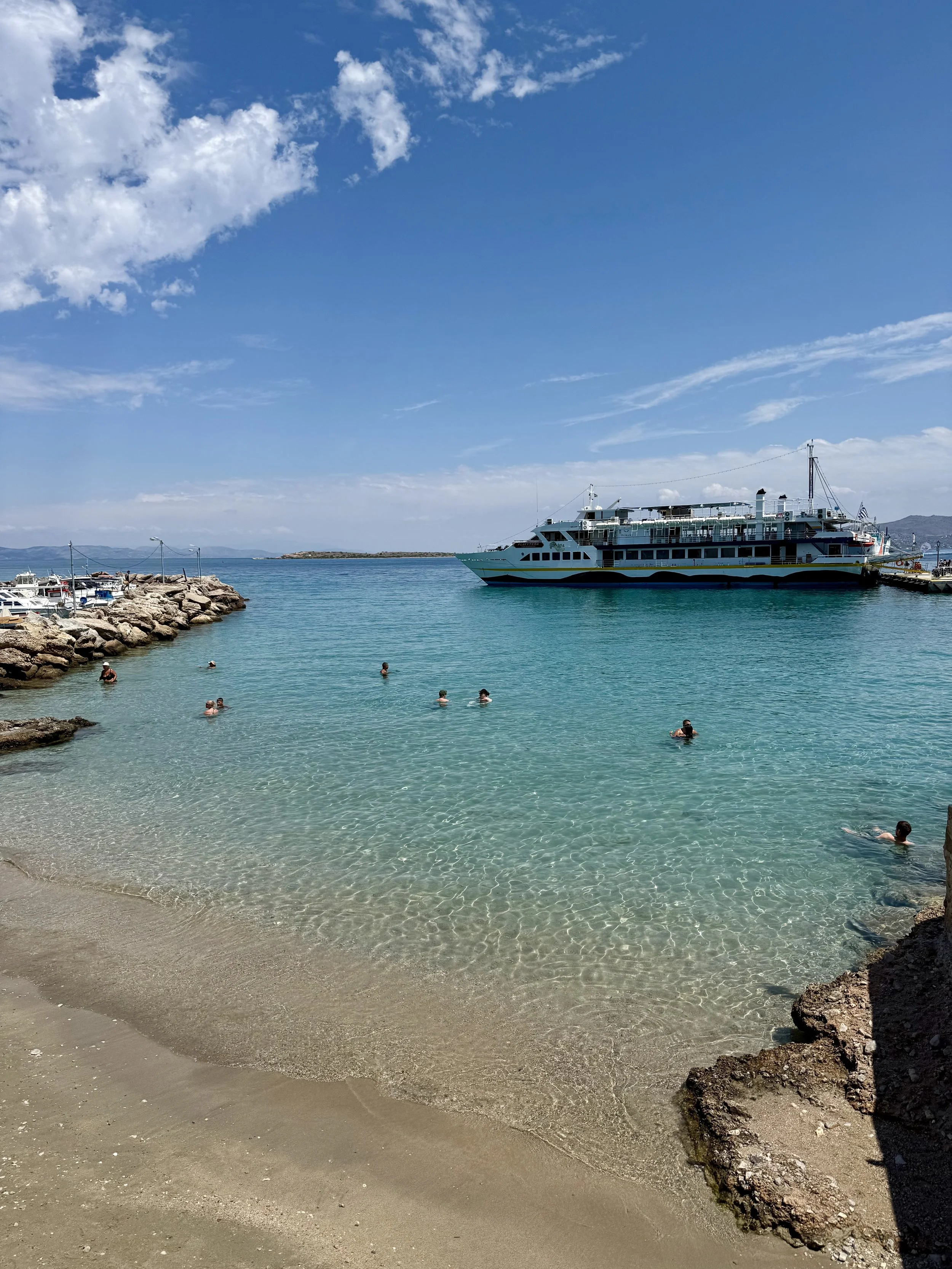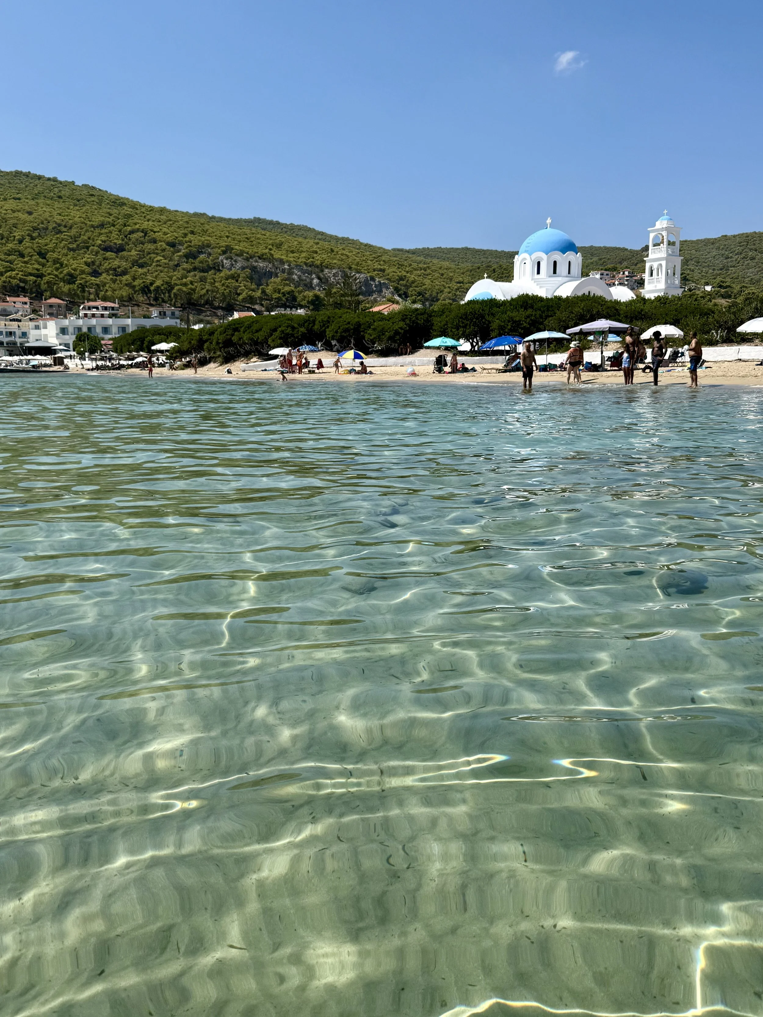 Vi är glada att vi valde att bo i Skala för stranden här var toppen. Vi gillade stranden längst ut på udden vid kyrkan där det var härlig sandstrand. Går du runt hörnet blir det mer grus och sten och färgen på vattnet är galet blått. Det finns en del solstolar ute på udde som kostar runt €20 för två med parasoll men man får vara snabb speciellt på söndagar då nästan alla är tagna när första båten från Aten anlänt.