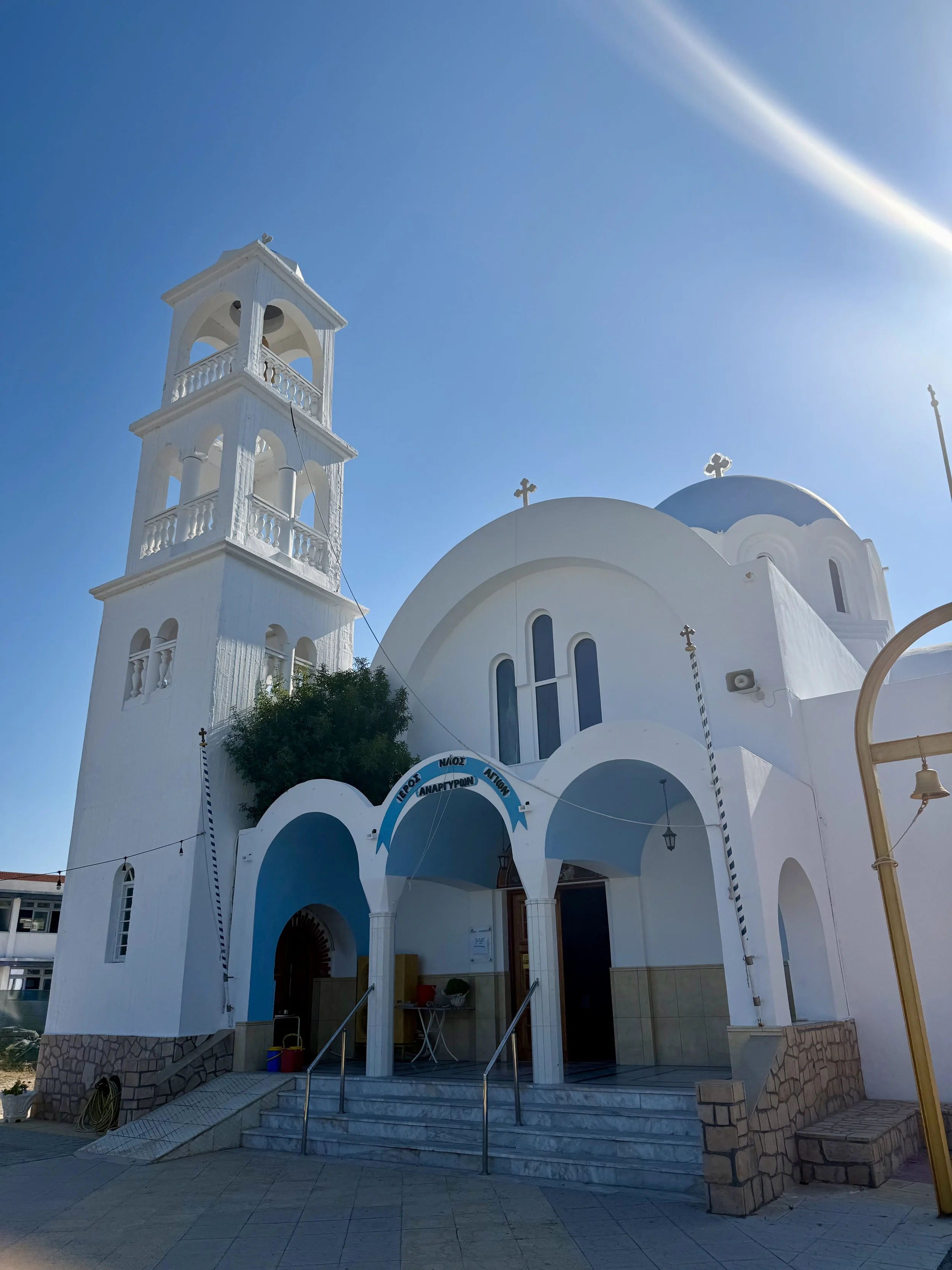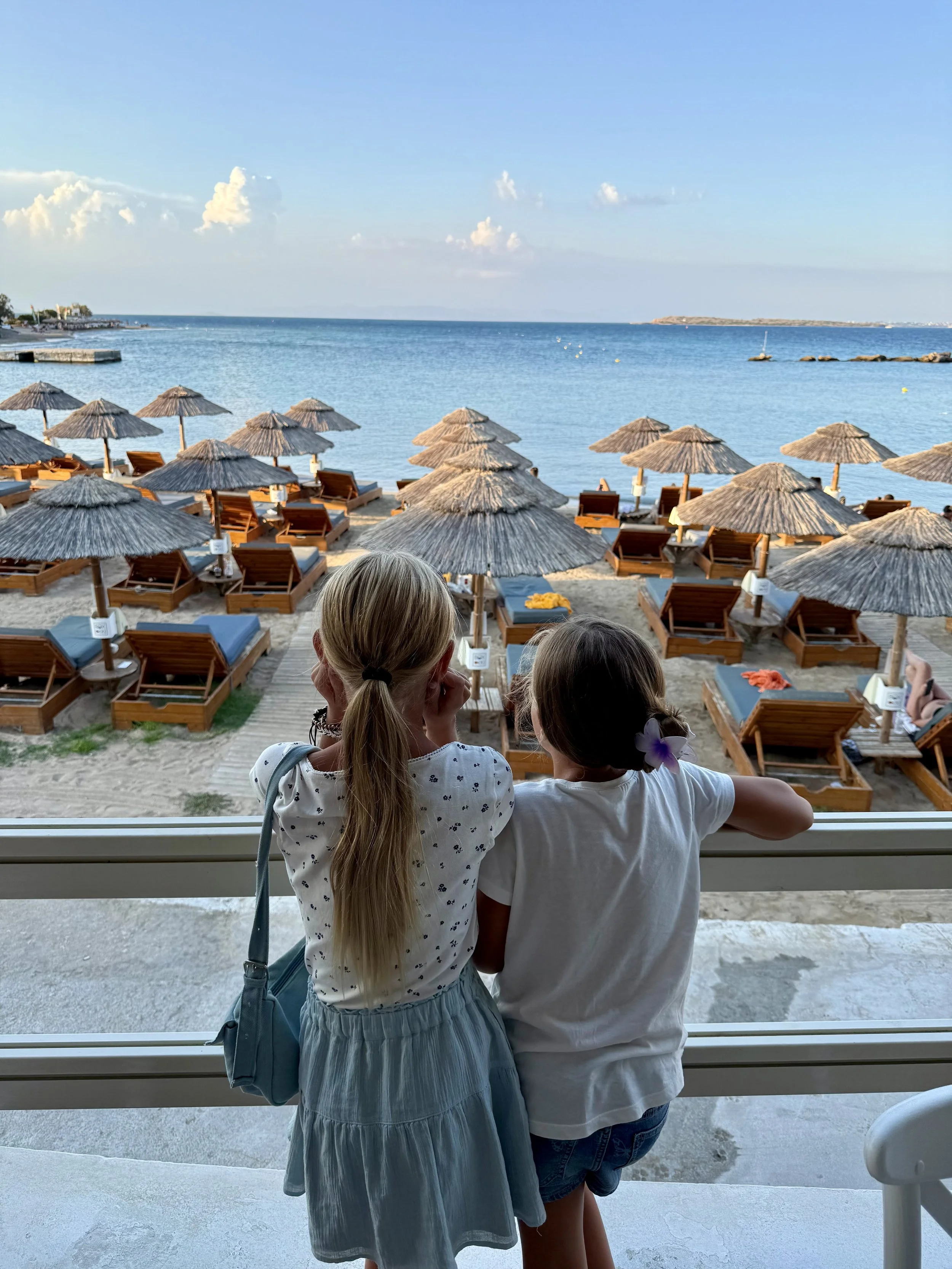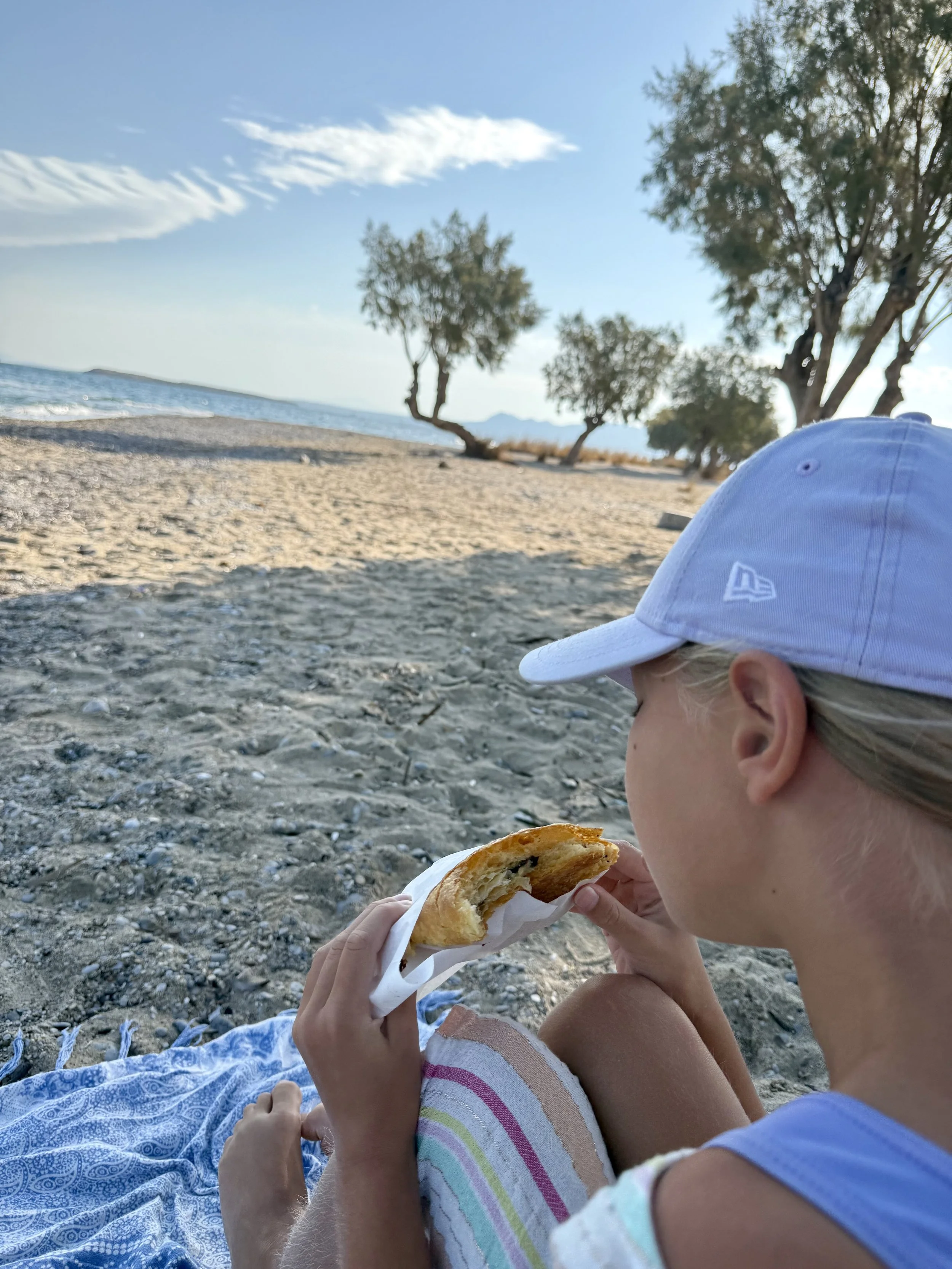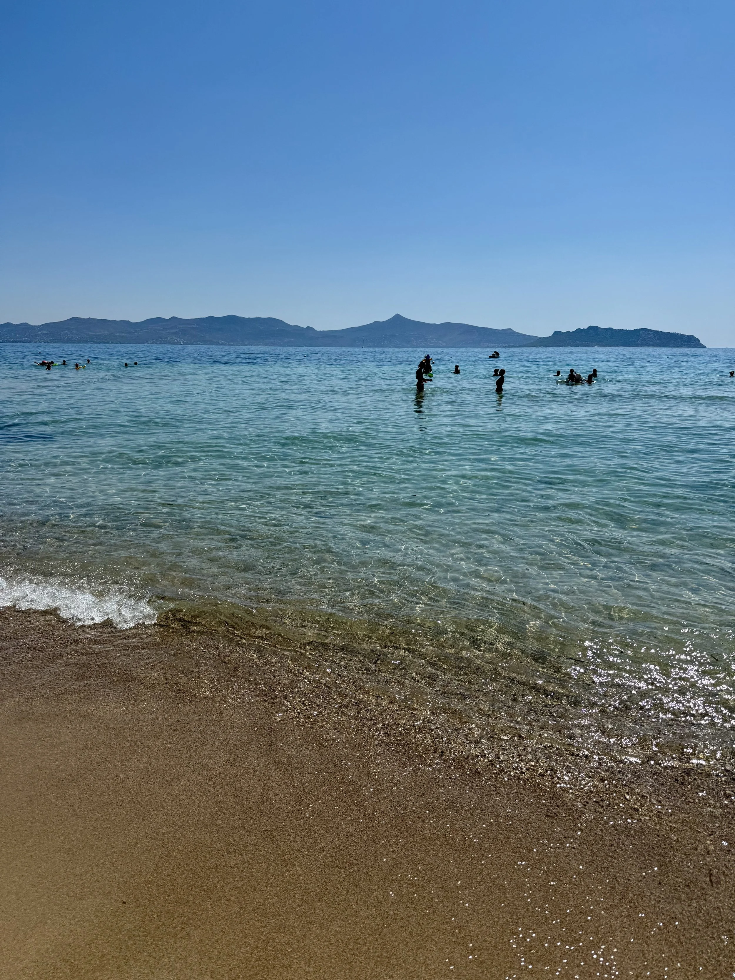 Vi är glada att vi valde att bo i Skala för stranden här var toppen. Vi gillade stranden längst ut på udden vid kyrkan där det var härlig sandstrand. Går du runt hörnet blir det mer grus och sten och färgen på vattnet är galet blått. Det finns en del solstolar ute på udde som kostar runt €20 för två med parasoll men man får vara snabb speciellt på söndagar då nästan alla är tagna när första båten från Aten anlänt.