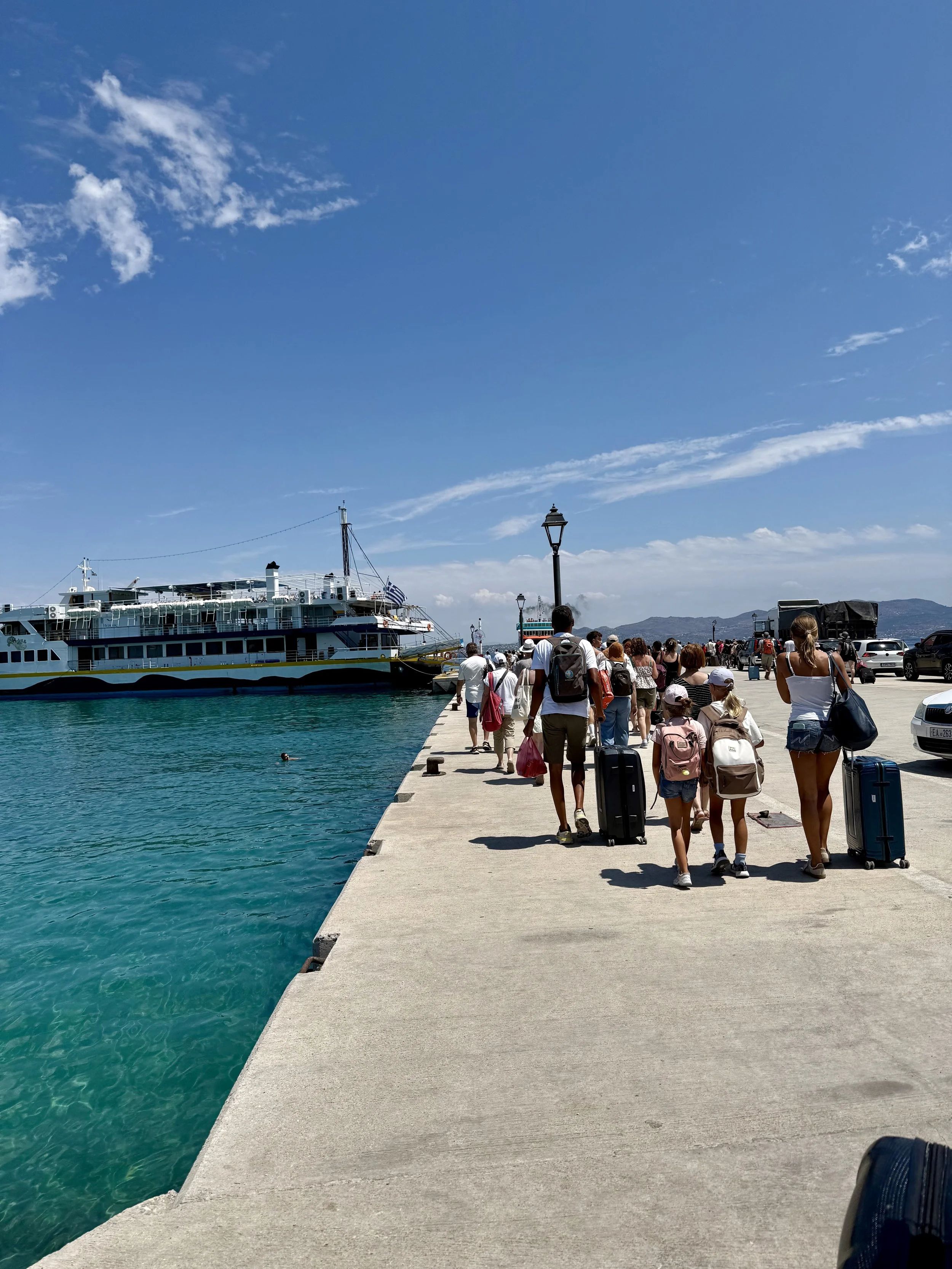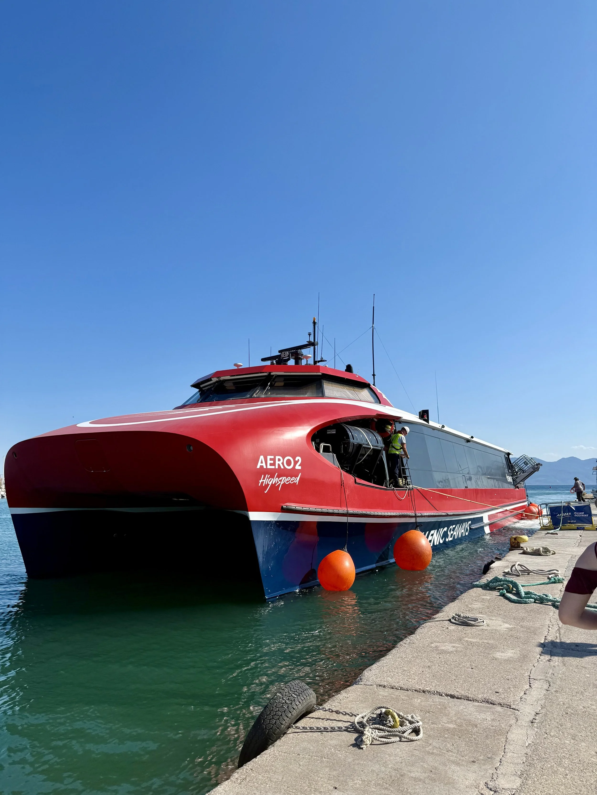 När vi lämnade Agistri tog vi färjan till Aten. Den stora färjan som tar 1h och 40 minuter går direkt från Skala och vattnet är så klart att du kan bada direkt vid hamnen. Saronic som vi åkte med kostaade runt €12 och halva priset för barn. (Det finns också en snabbfärja till Aten som tar 55 minuter och kostar €20 per person)