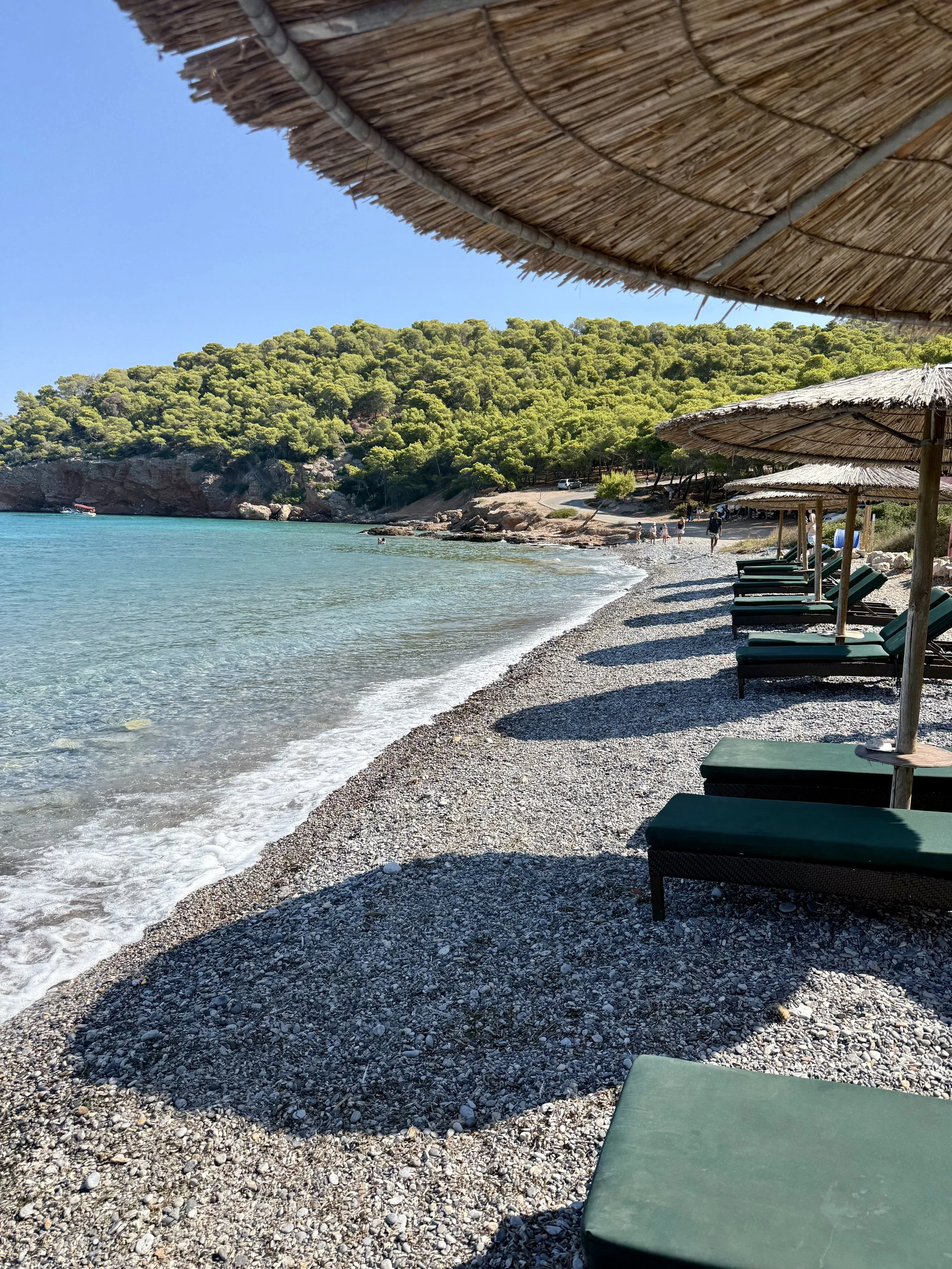 Detta är Agistris finaste strand! Vi tog bussen till denna strand från Skala, en resa som tog ca 10 minuter. När du kommer fram får du gå ca 5 min genom pinjeskog o sen möts du av den mest otroliga strand. Här fanns det ca 15 par solstolar så ett tips är att ta första bussen! Här är det sten och inte sand men det är också just därför vattnet är sinnessjukt blått och snorklingen är fantastisk. (Badskor rekommenderas) Solstolar här kostade €20 per par.