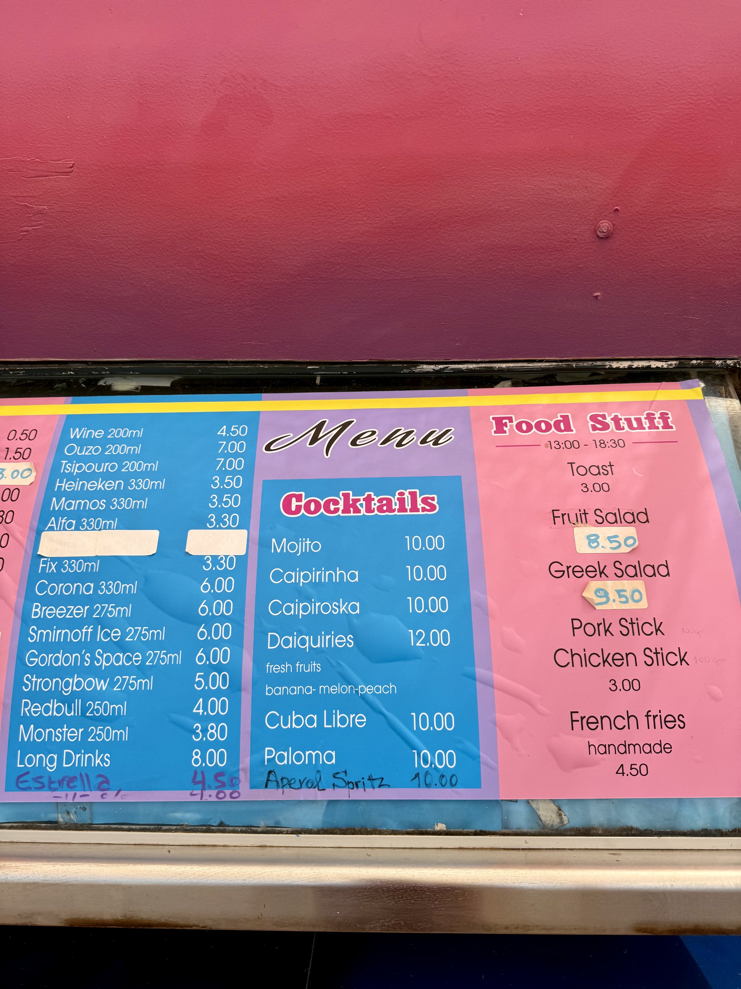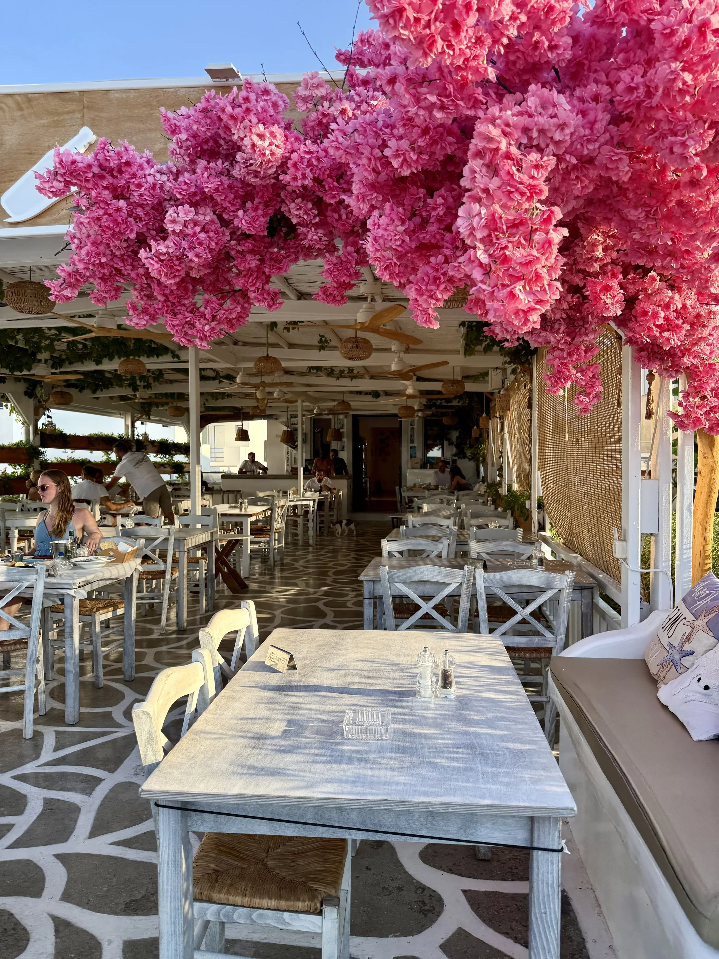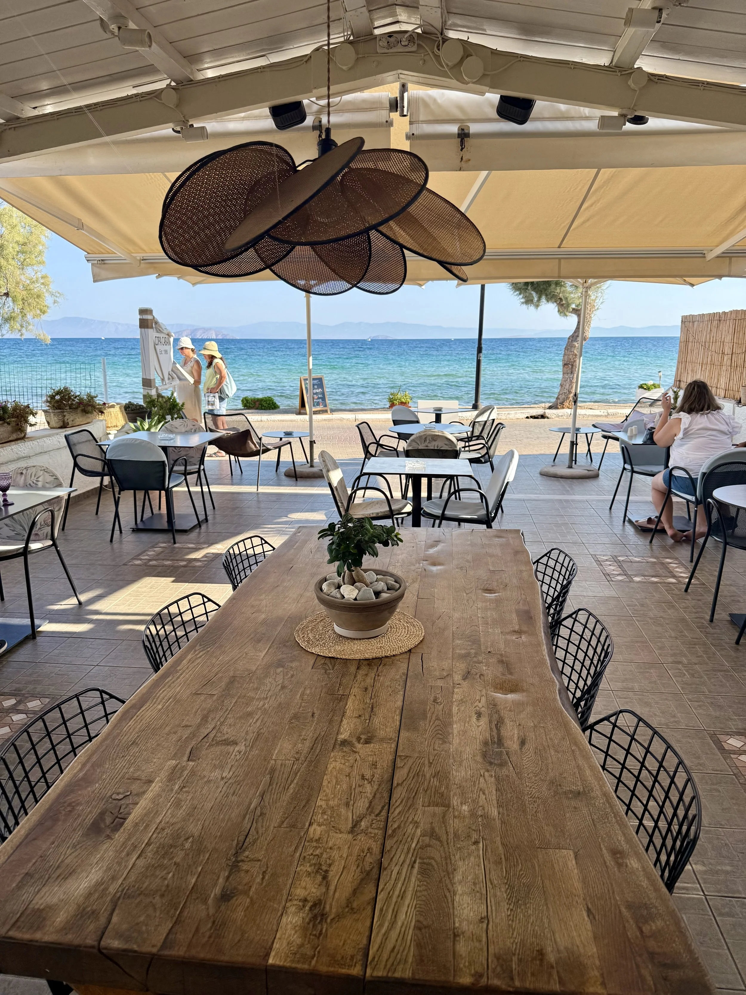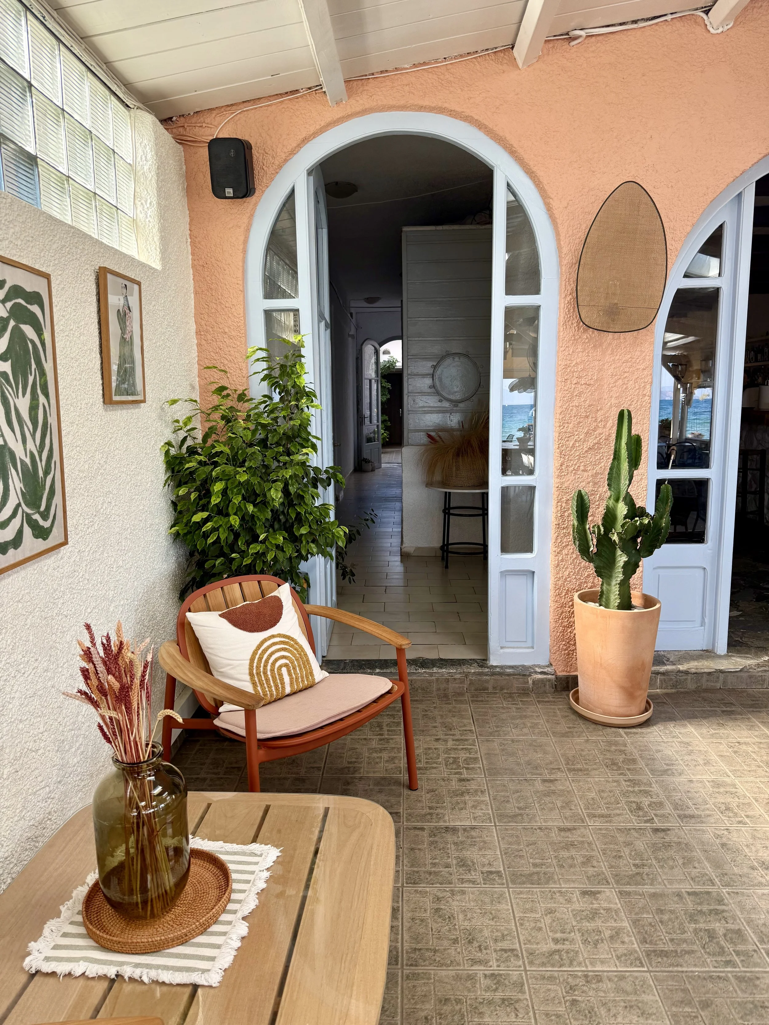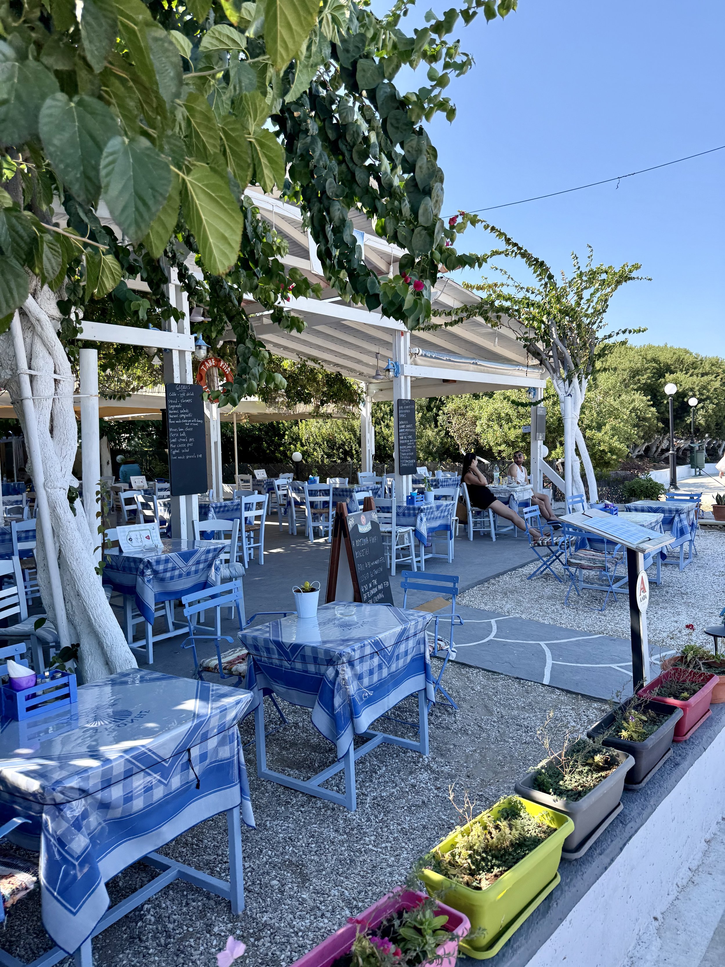 En härlig bar i Skala där du kan sitta inne, i ett fönster eller på stranden där de har solstolar.