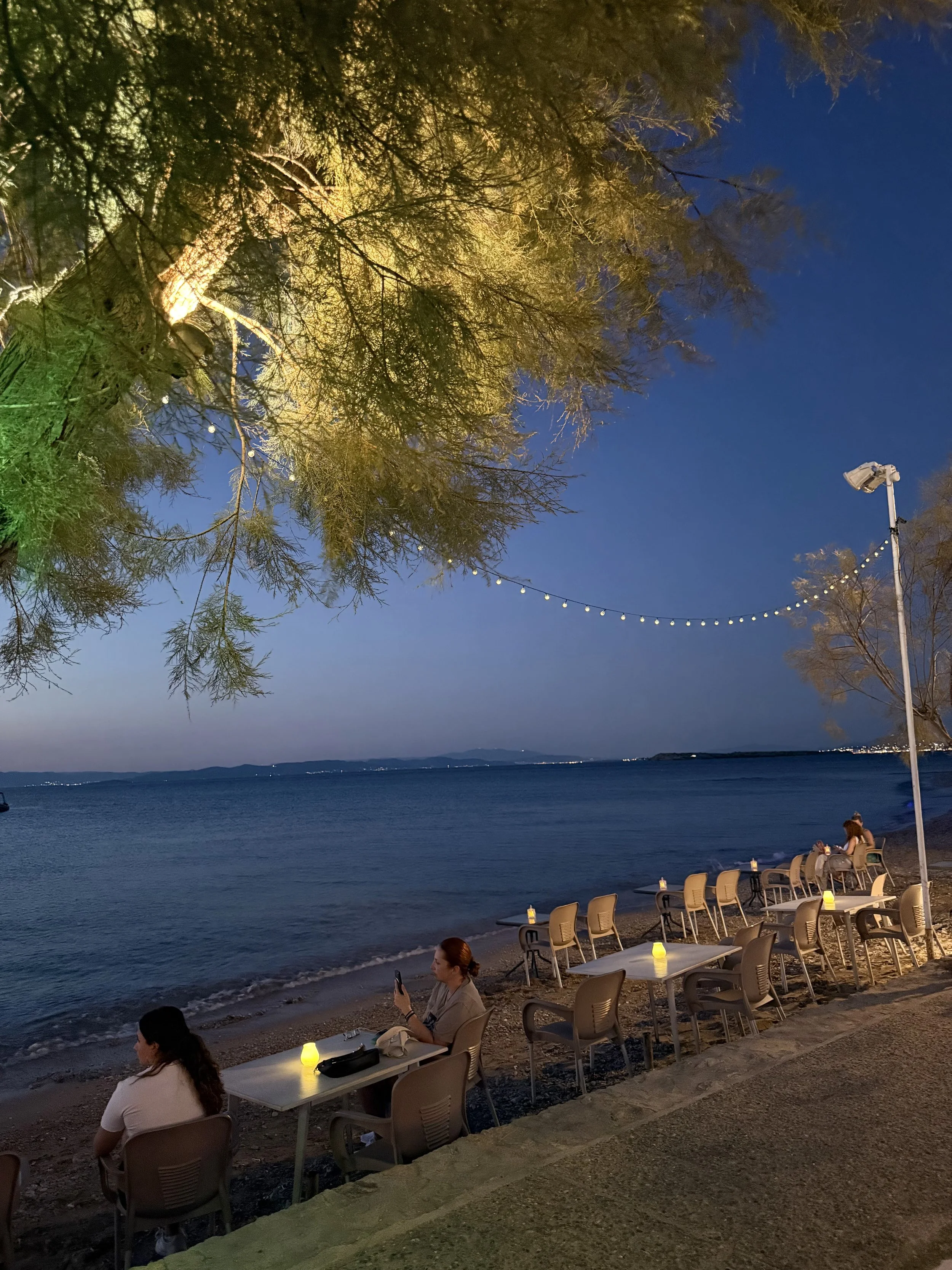 Här finns en liten restaurang som serverar kylda drycker och de grillar också grillspett som serveras med tzatiski och pommes - jättegoda!