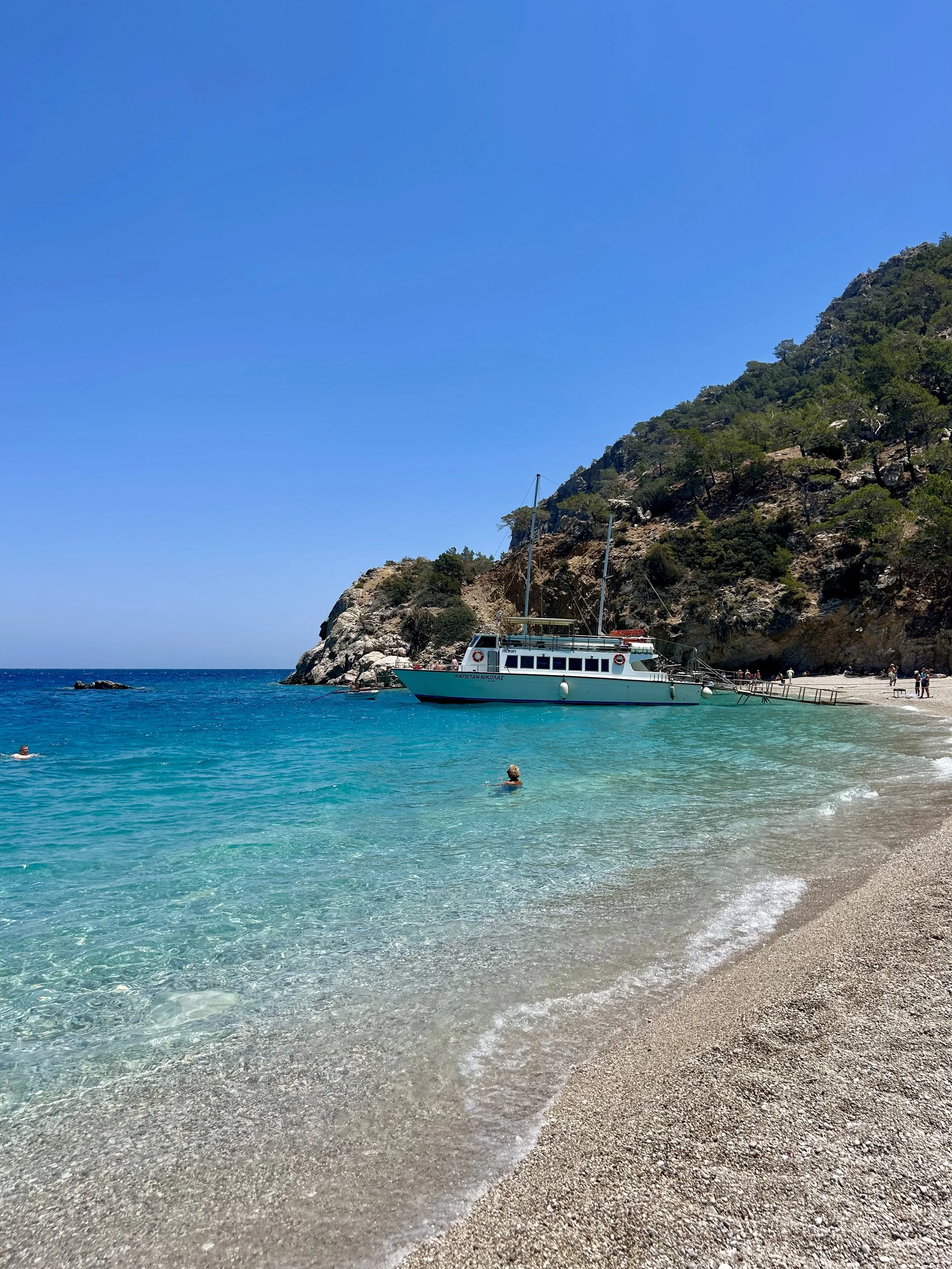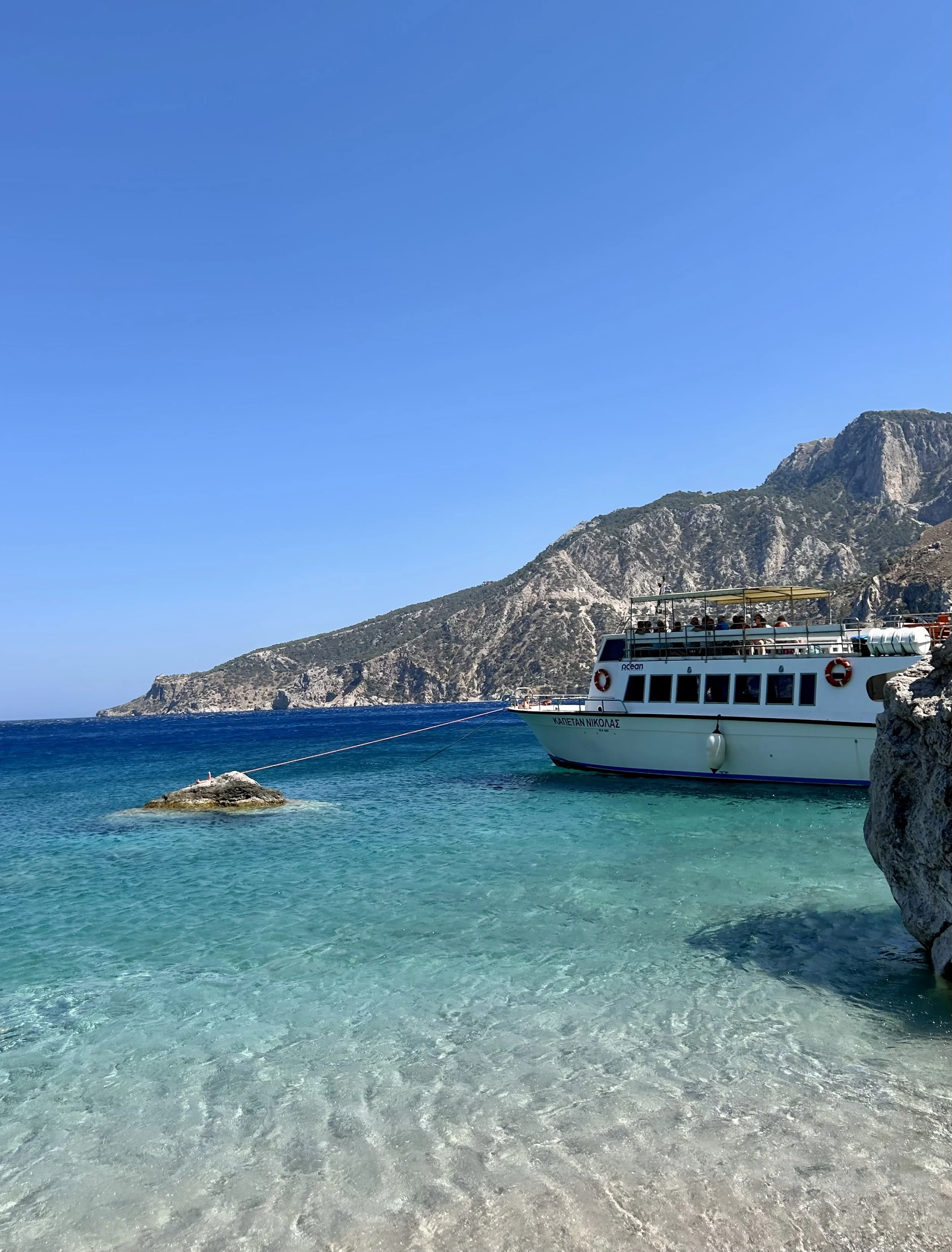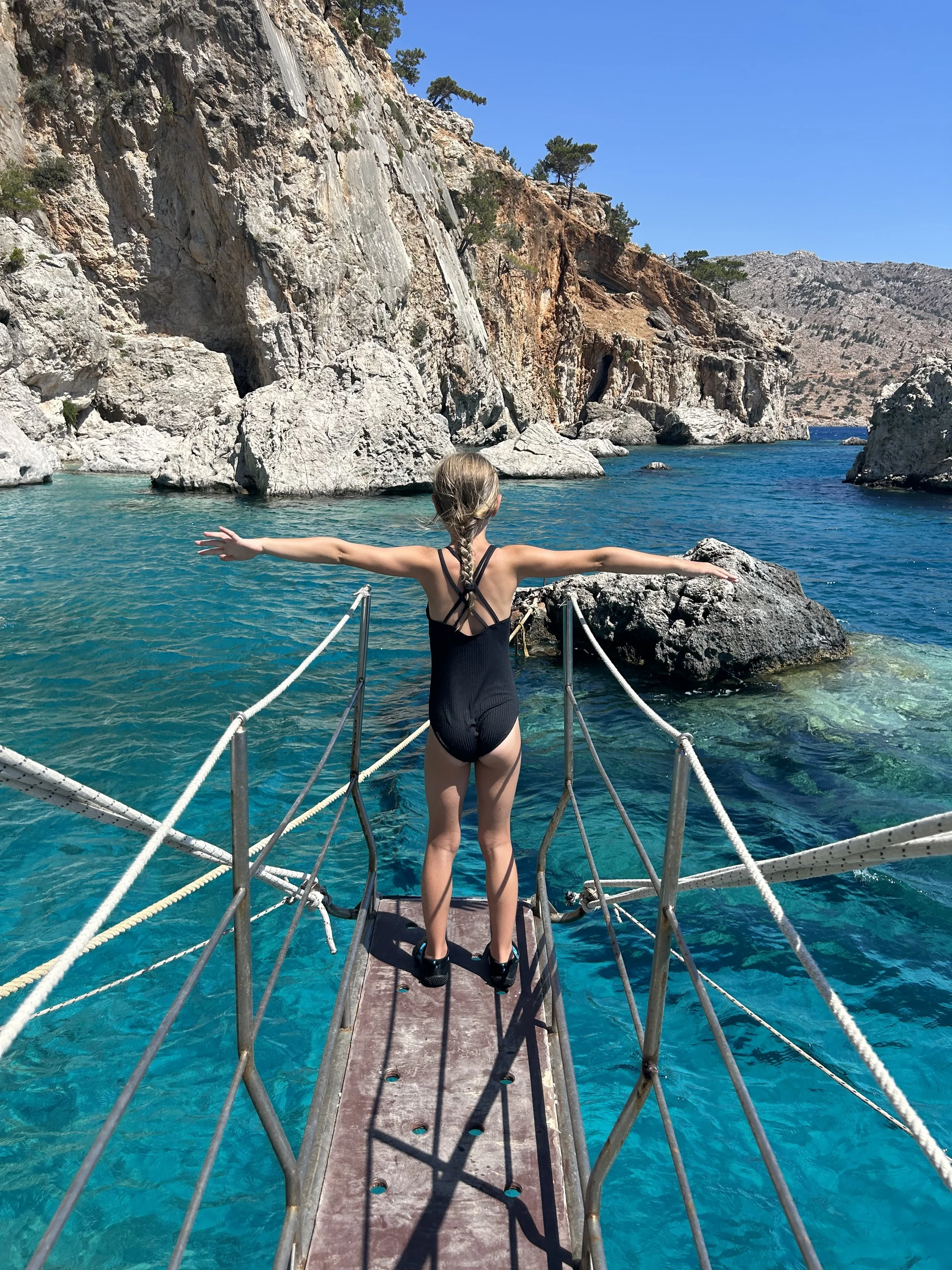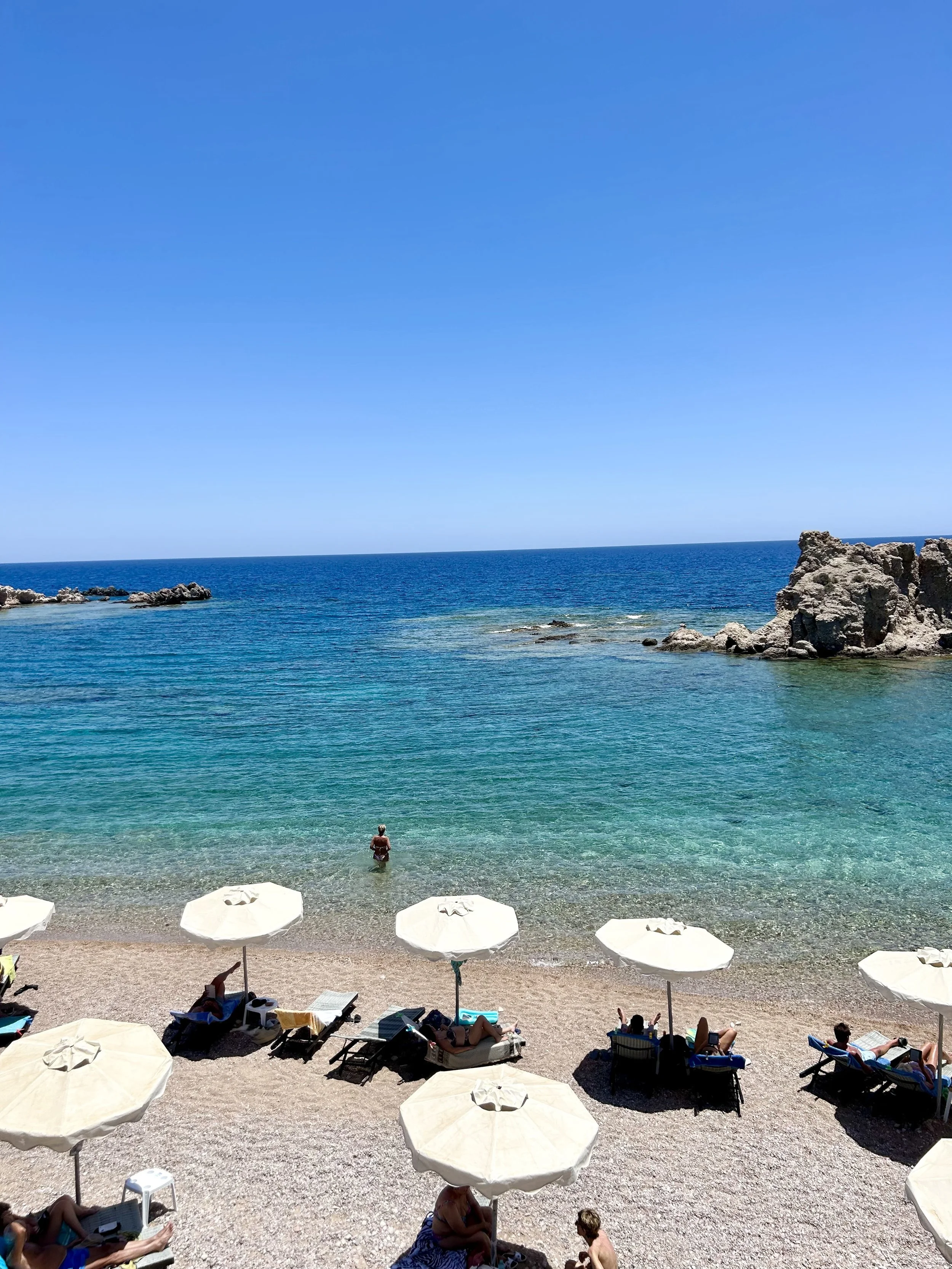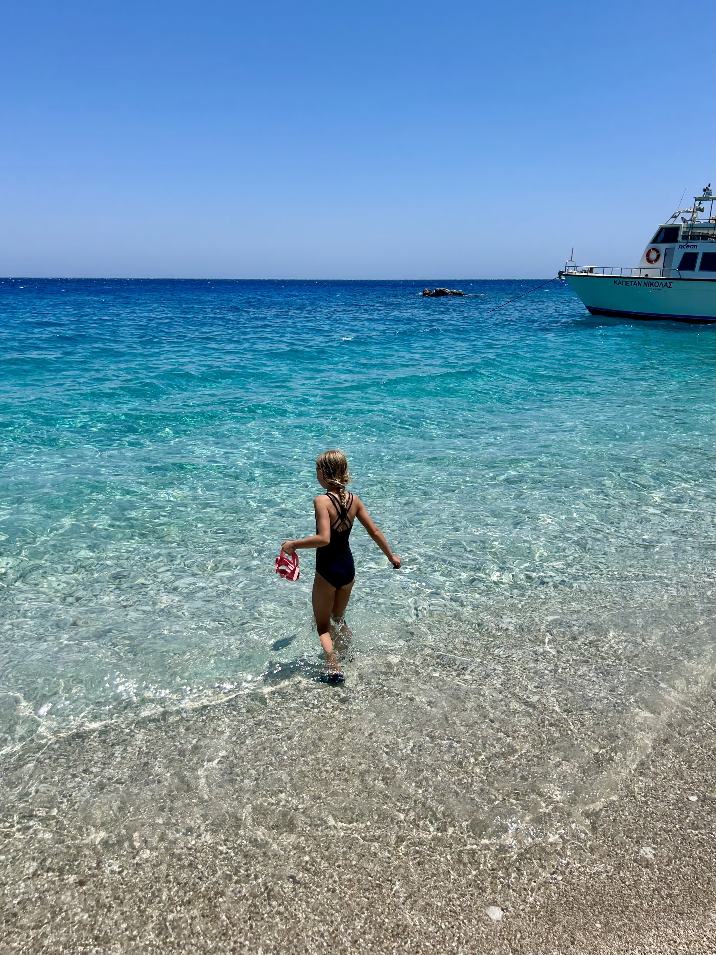 Apella Beach åkte vi båt till en dag och den är verkligen wow. Den klassas som en av Greklands finaste ständer, har en magisk inramning och vattnet är knallturkost. Här är det småsten och badskor är bra att ha. Under vår båttur besökte vi tre olika stränder med båt och det ingick lunch (grillad kyckling på stranden). Vi bokade denna utflykt via hotellet där det fanns reklam för massor av olika båtturer.