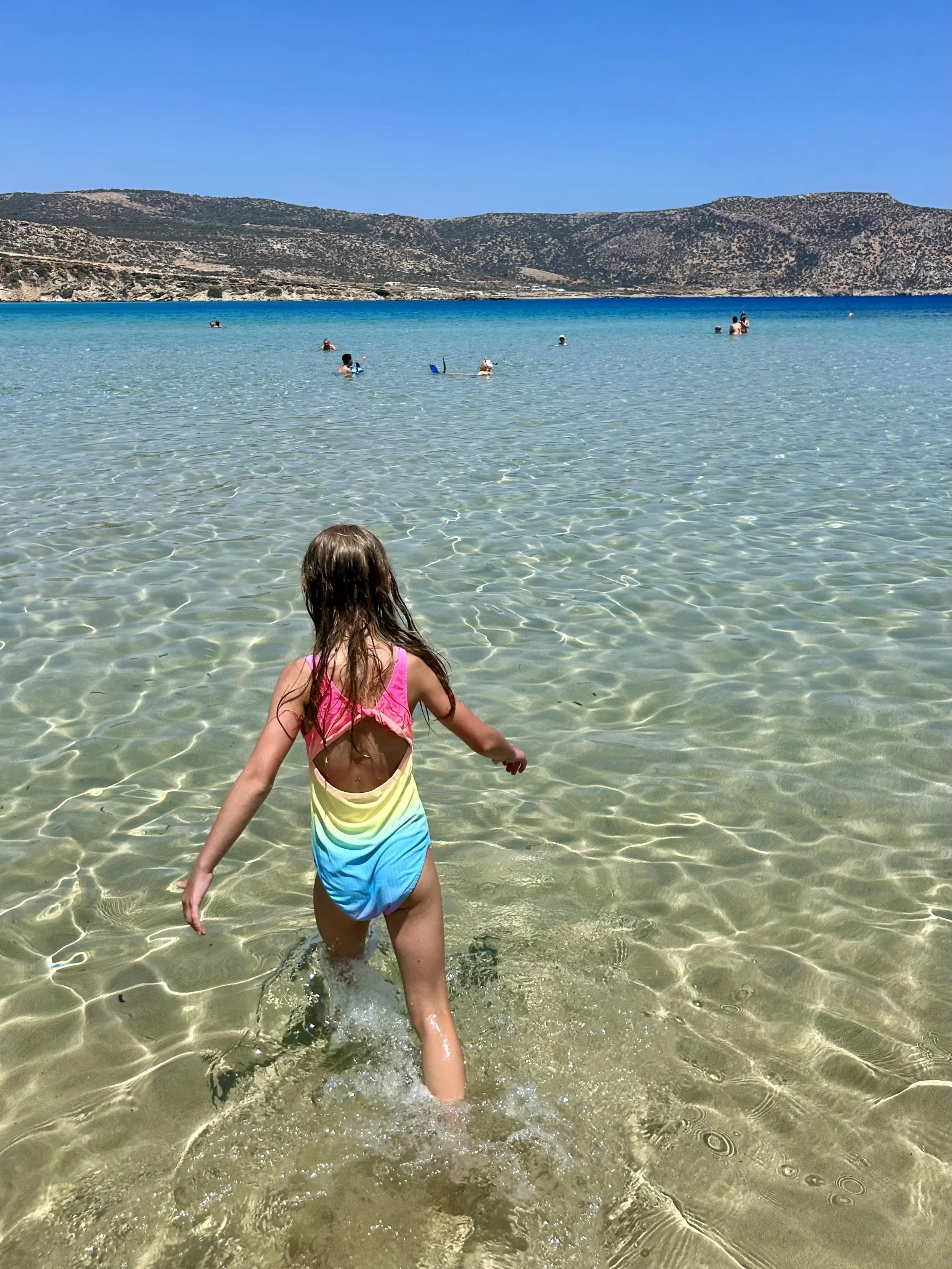Kyra Panagia Beach är en av öns finaste och här är det också bra att ha badskor. Vattnet är otroligt klart och botten är klappersten. Ovanför stranden ligger en liten kyrka på en klippa vilket gör att hela omgivingen blir fem plus.