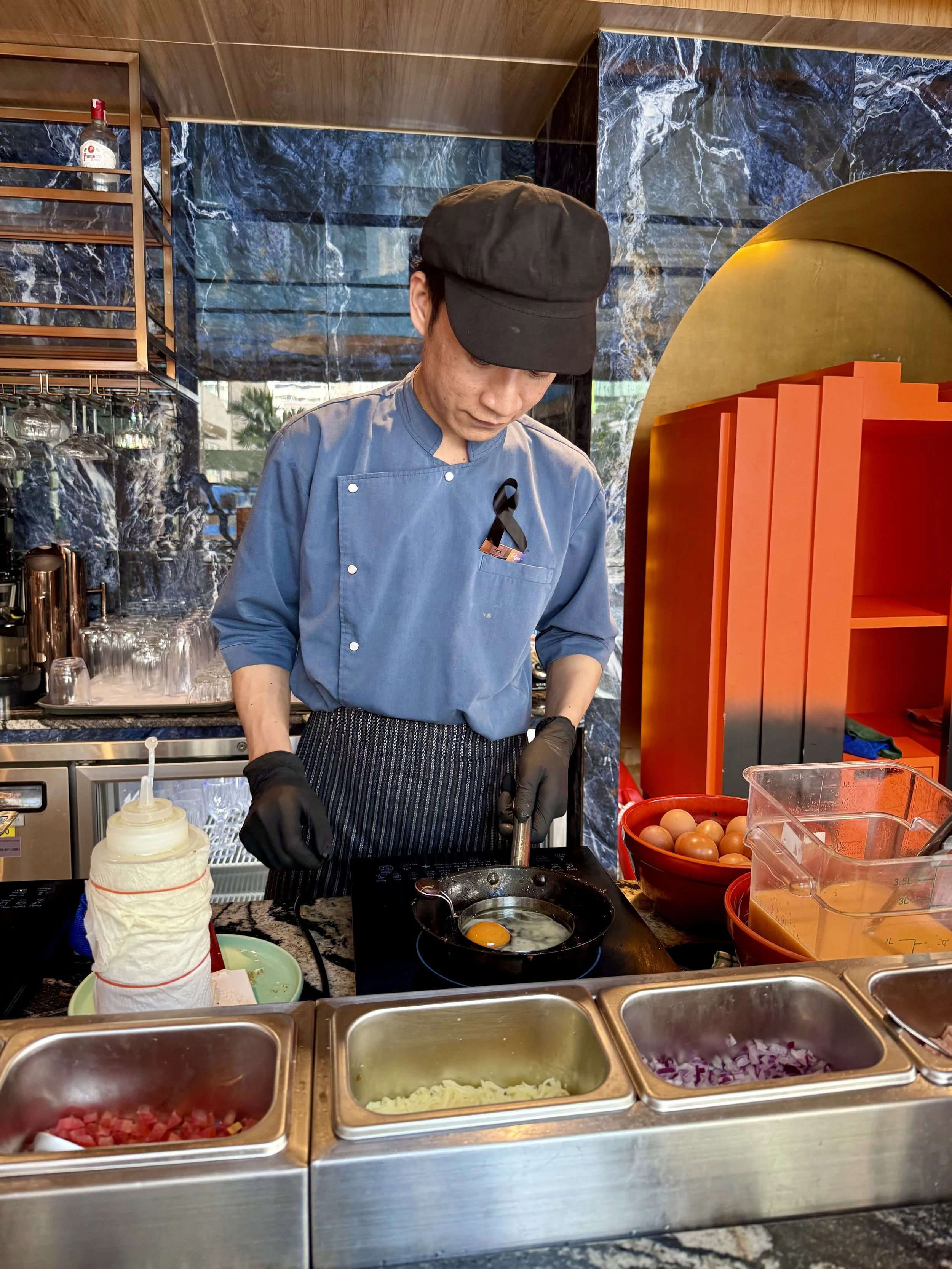 Frukosten var kanon med äggkock utomhus, mycket färsk frukt, yohurt, bröd, pålägg, sötsaker etc och bra med plats - inte alls bullrig då man både kunde sitta inne och utomhus. Även mysigt att sitta där ute på kvällen bland skyskrapor oc