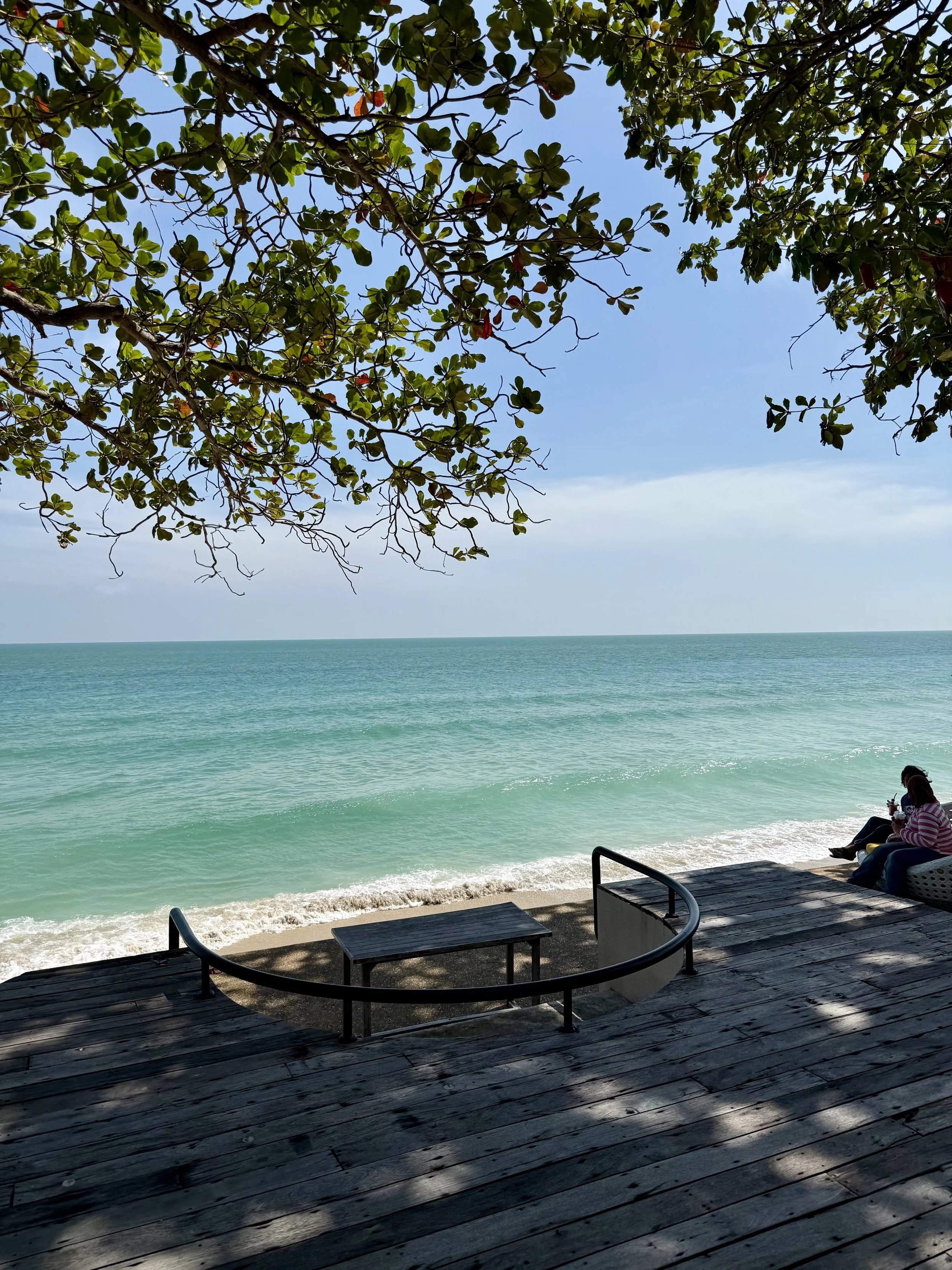 Ett nyöppnat ställe precis intill stranden där du kan ta en fika och sitta i hängstolar eller i trappor i etage mot havet.