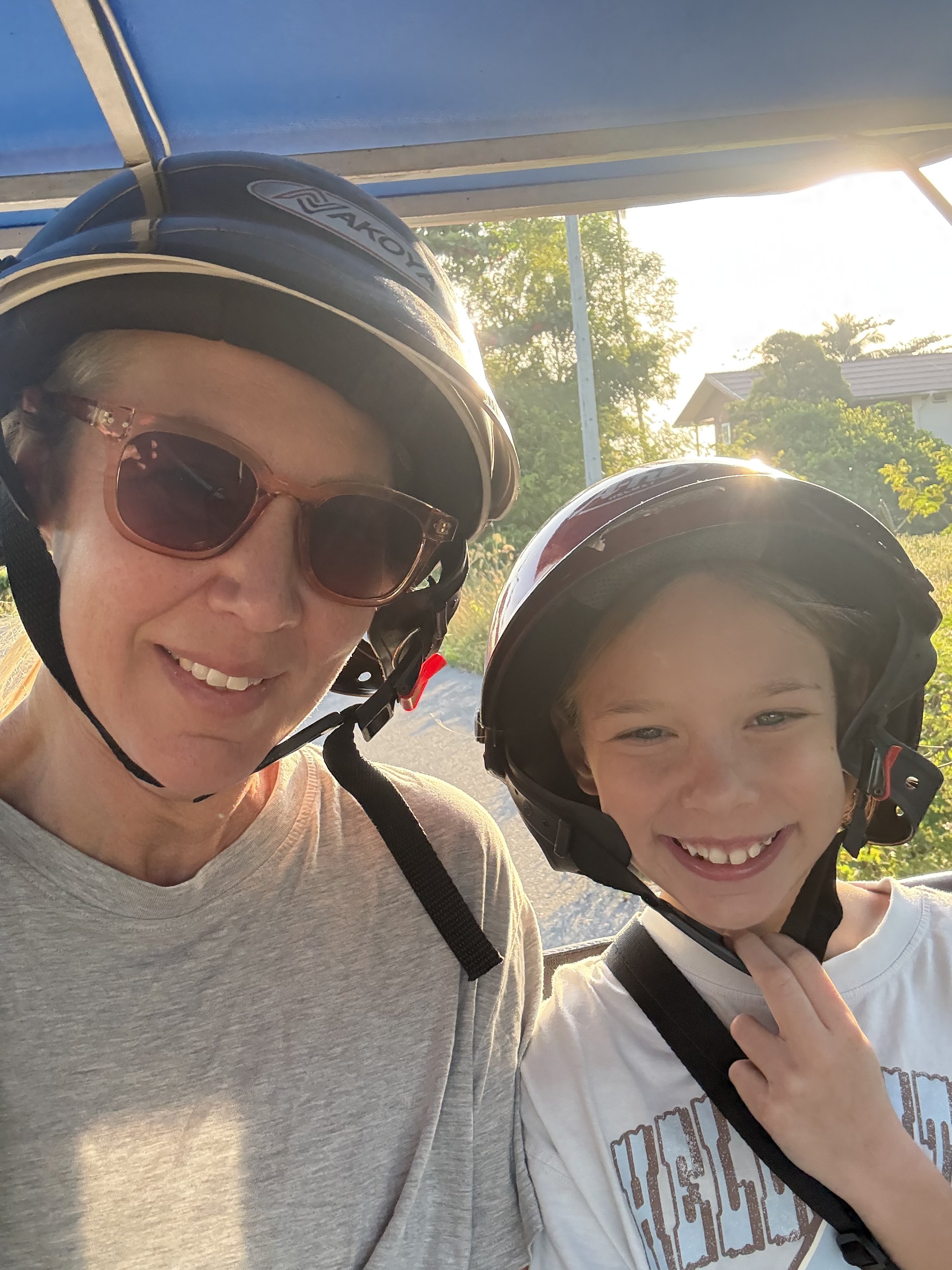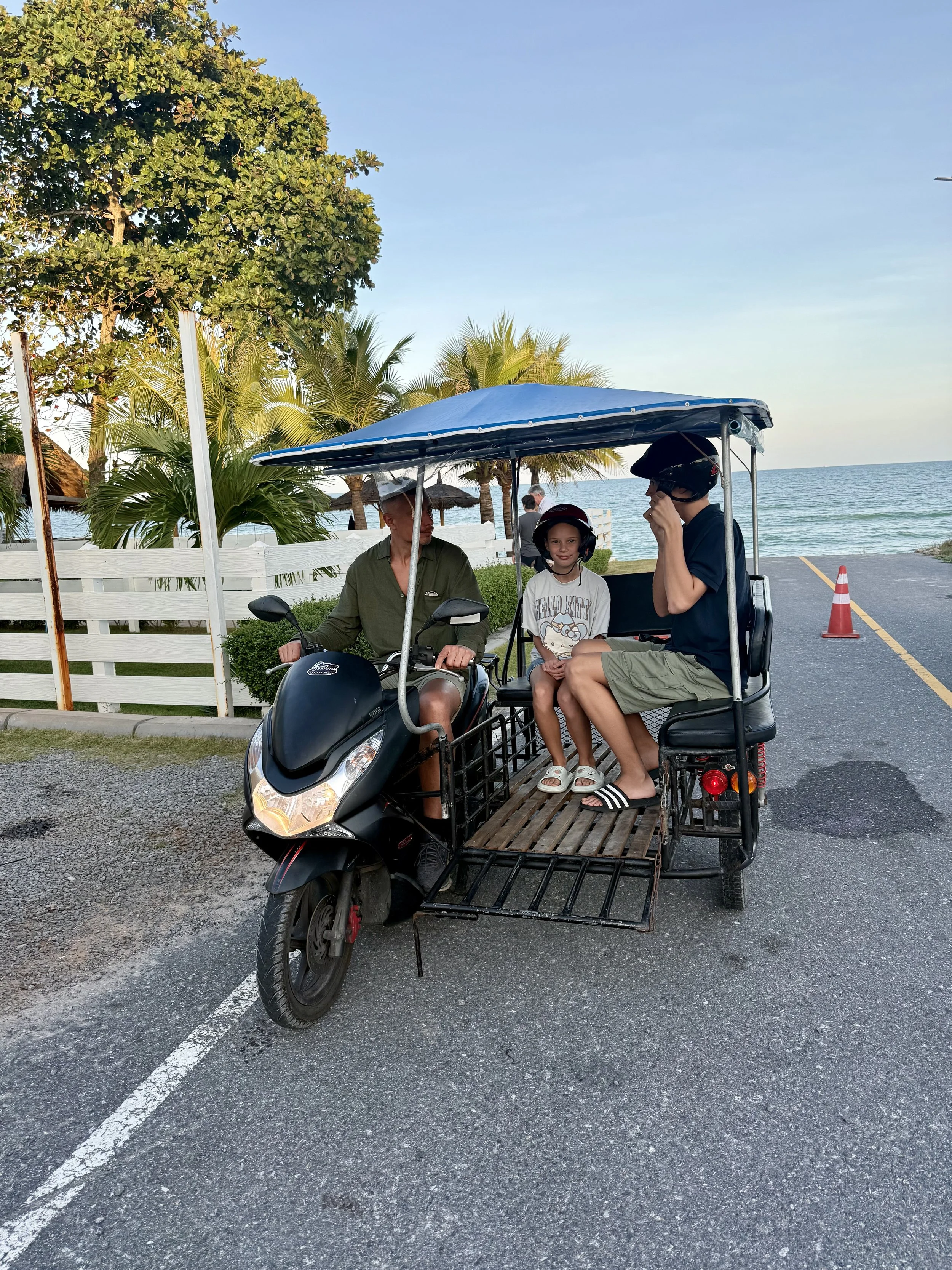 Du behöver hyra bil eller moped för att ta dig runt lätt här. Det finns inga taxibilar eller Grab som på större ställen. Vi hyrde en moped med sidovagn via hotellet. De flesta hotell ligger på den vackra stranden och det är ca 5km till själva staden Khanom där marknaden är, det finns 7/11, Big C etc