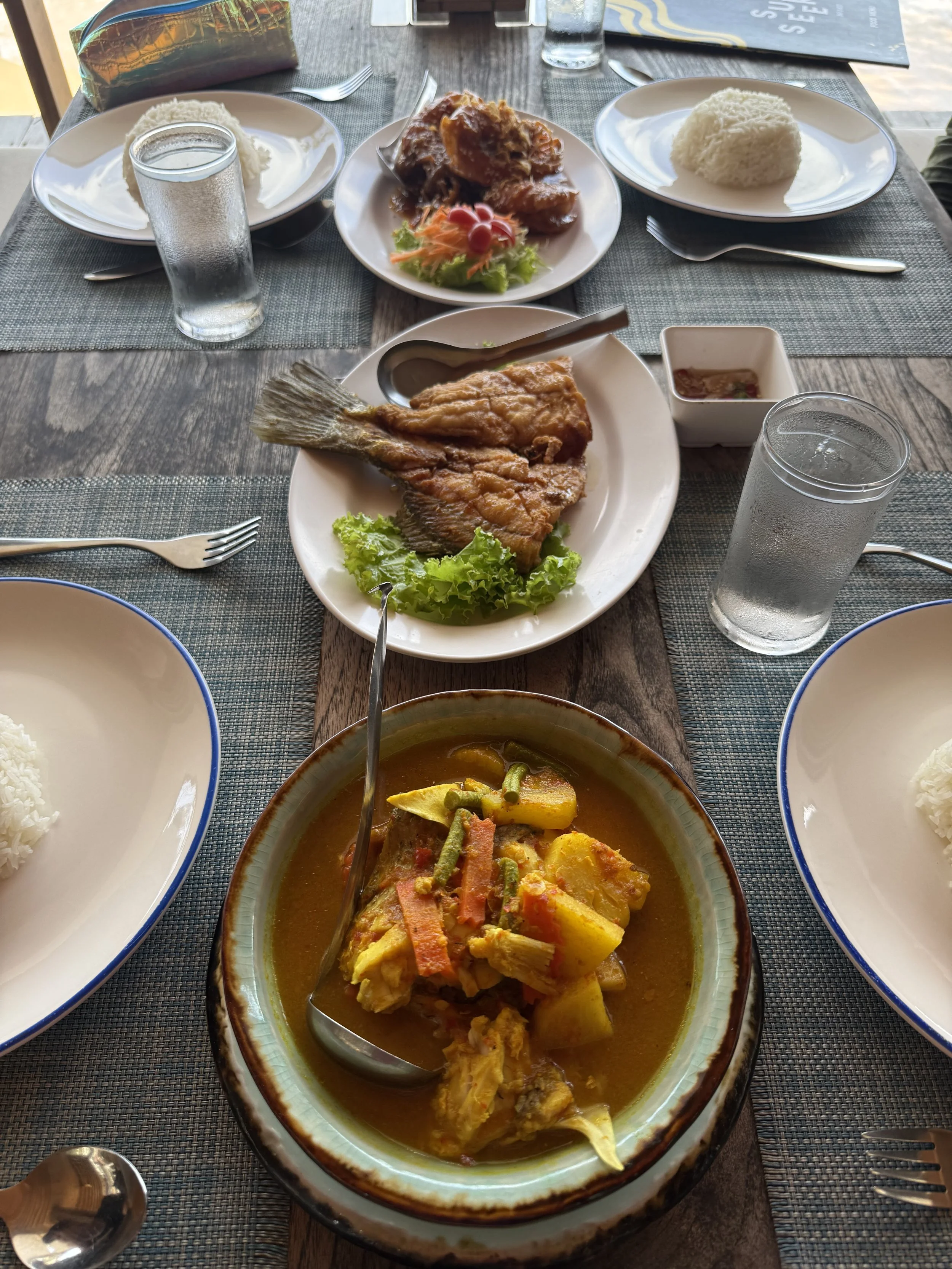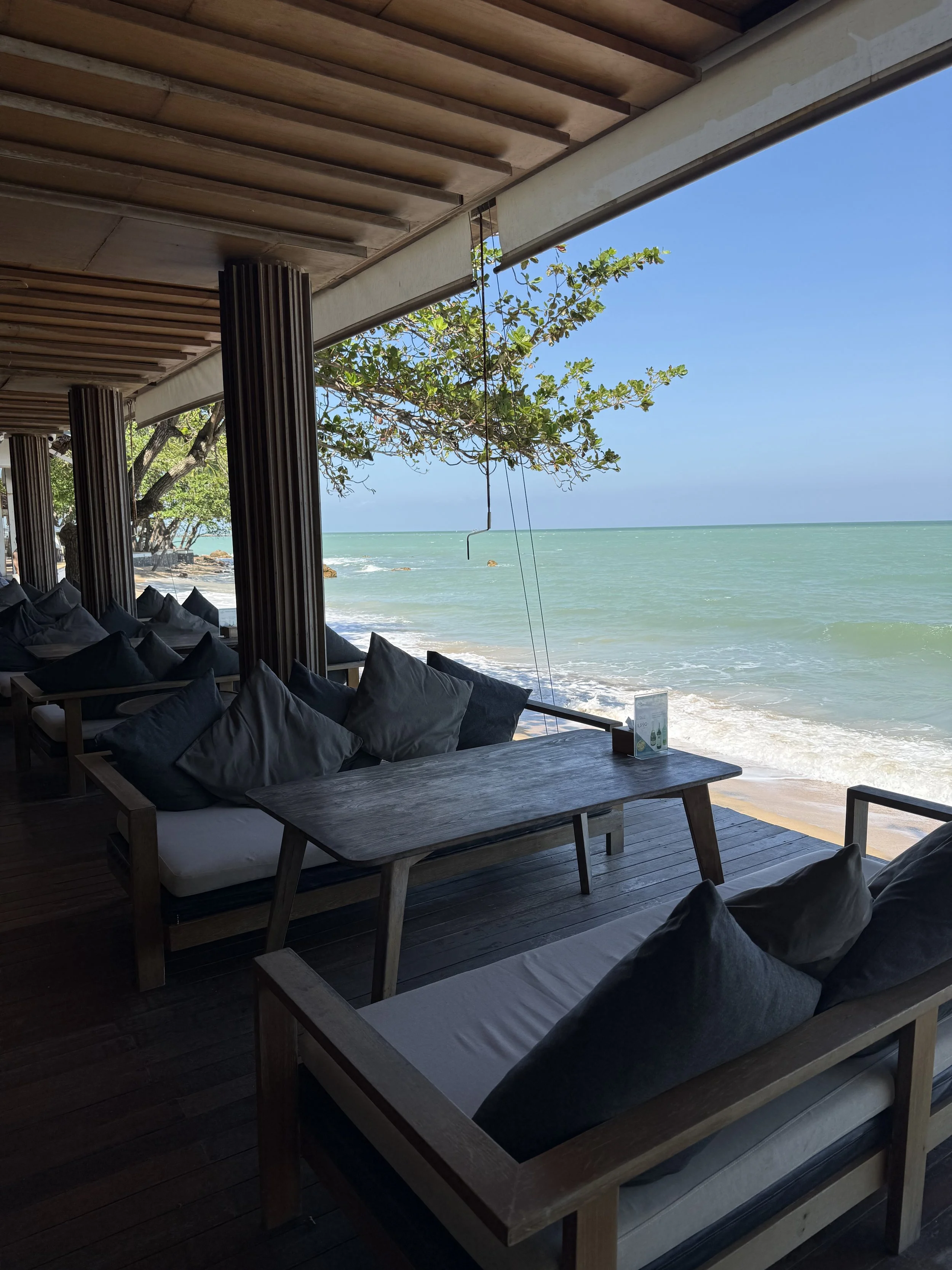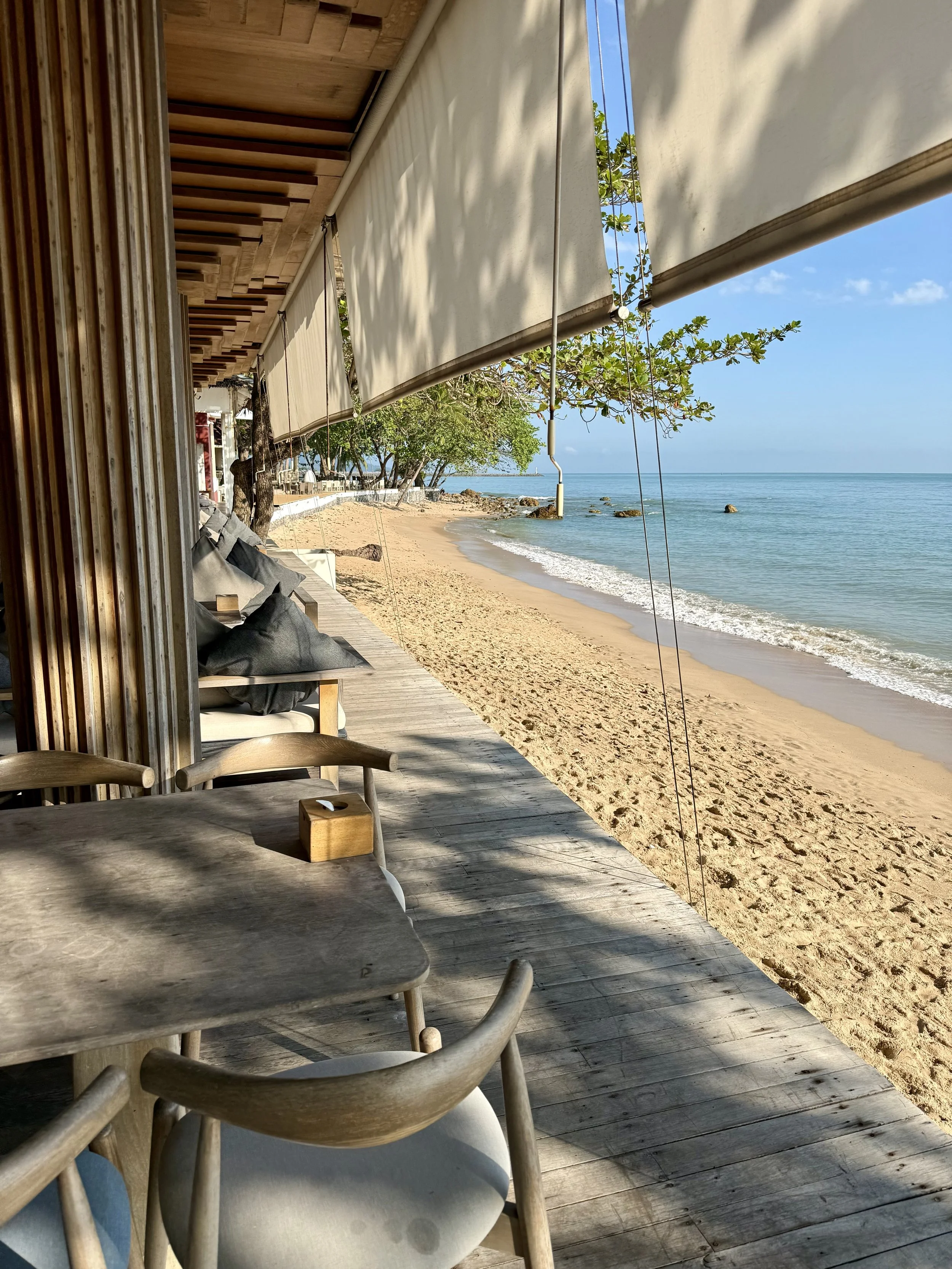 Vi åt i stort sett alla våra måltider på hotellet. Frukost ingår i priset och här serveras lokala delikatesser från Sichon, i kombination med västerländsk mat, frukt och självklart finns också en personlig äggkock. Att sitta på denna terrass att äta känns helt overkligt och det är ett lugnt som för tankarna att du sitter i ditt eget beachhouse.