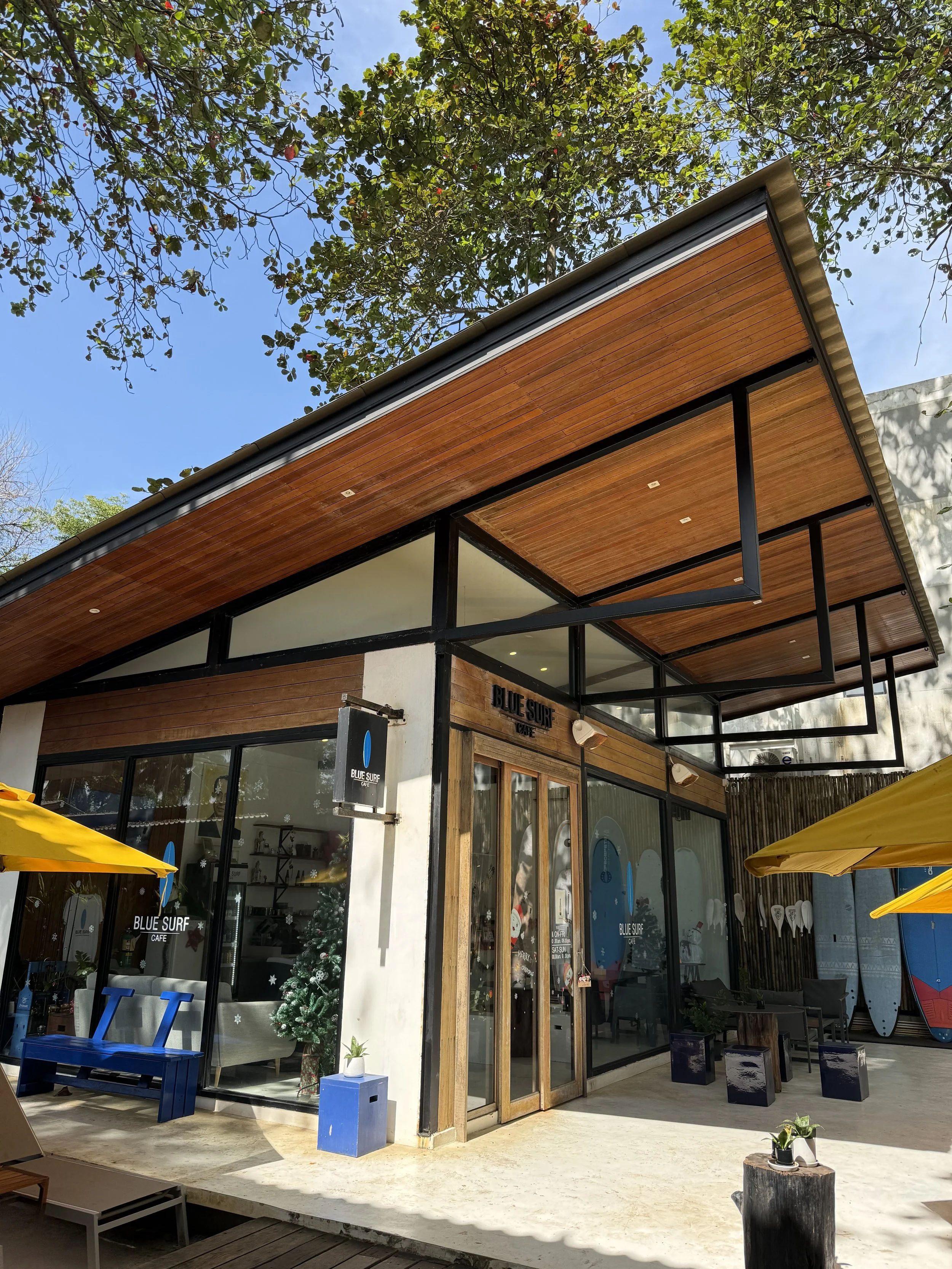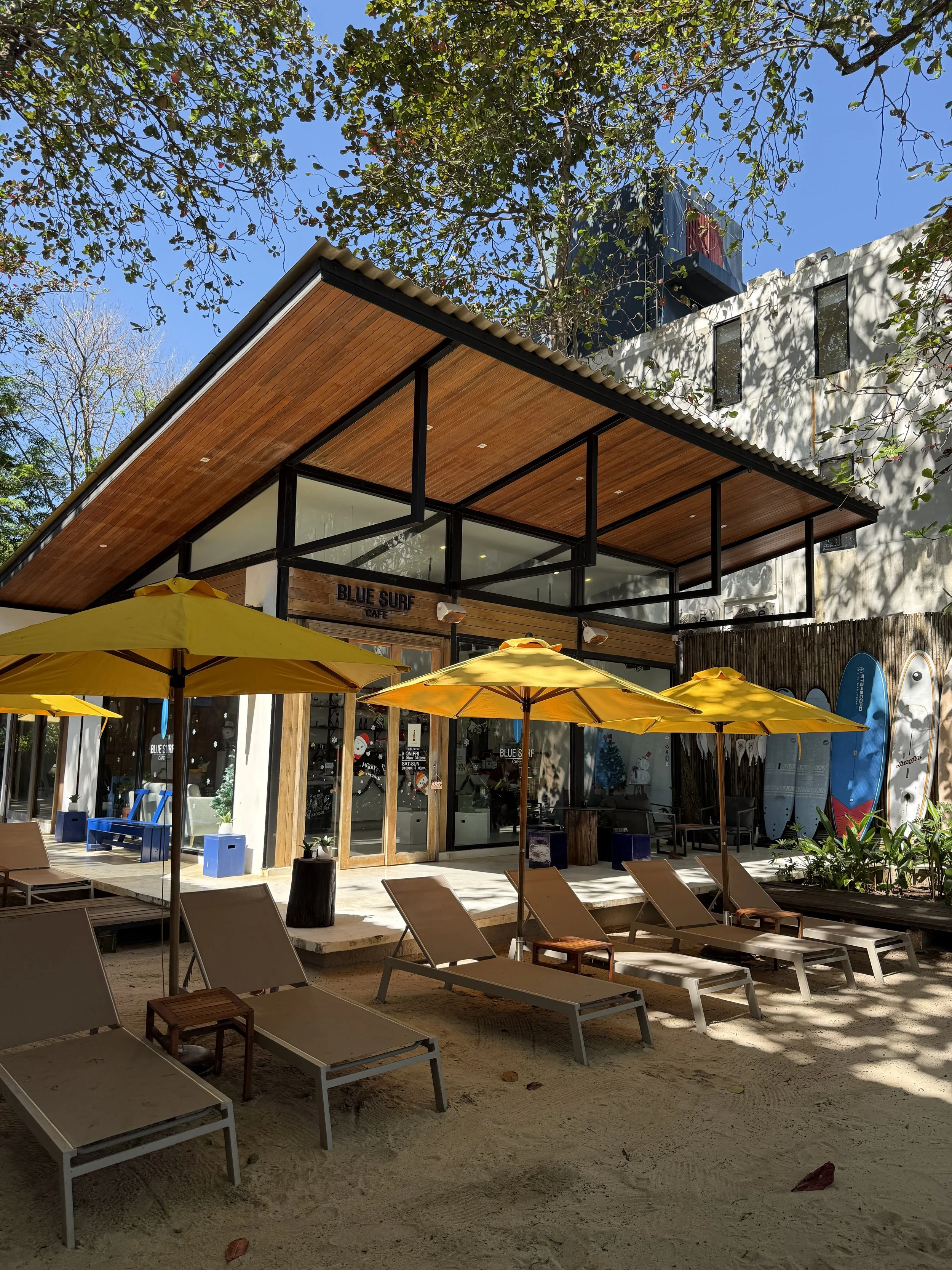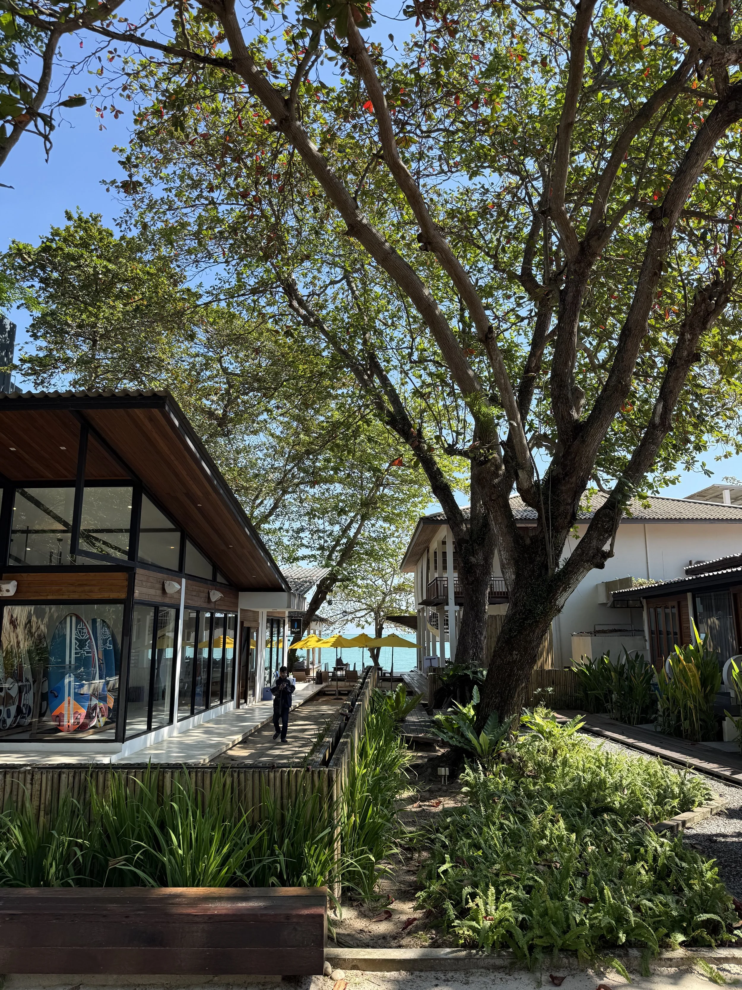 De har också ette eget cafe och bageri där de gör gott iskaffe och matcha. Du kan också hyra båt via hotellet. ta surflektioner eller bara låna en bräda på egen hand.