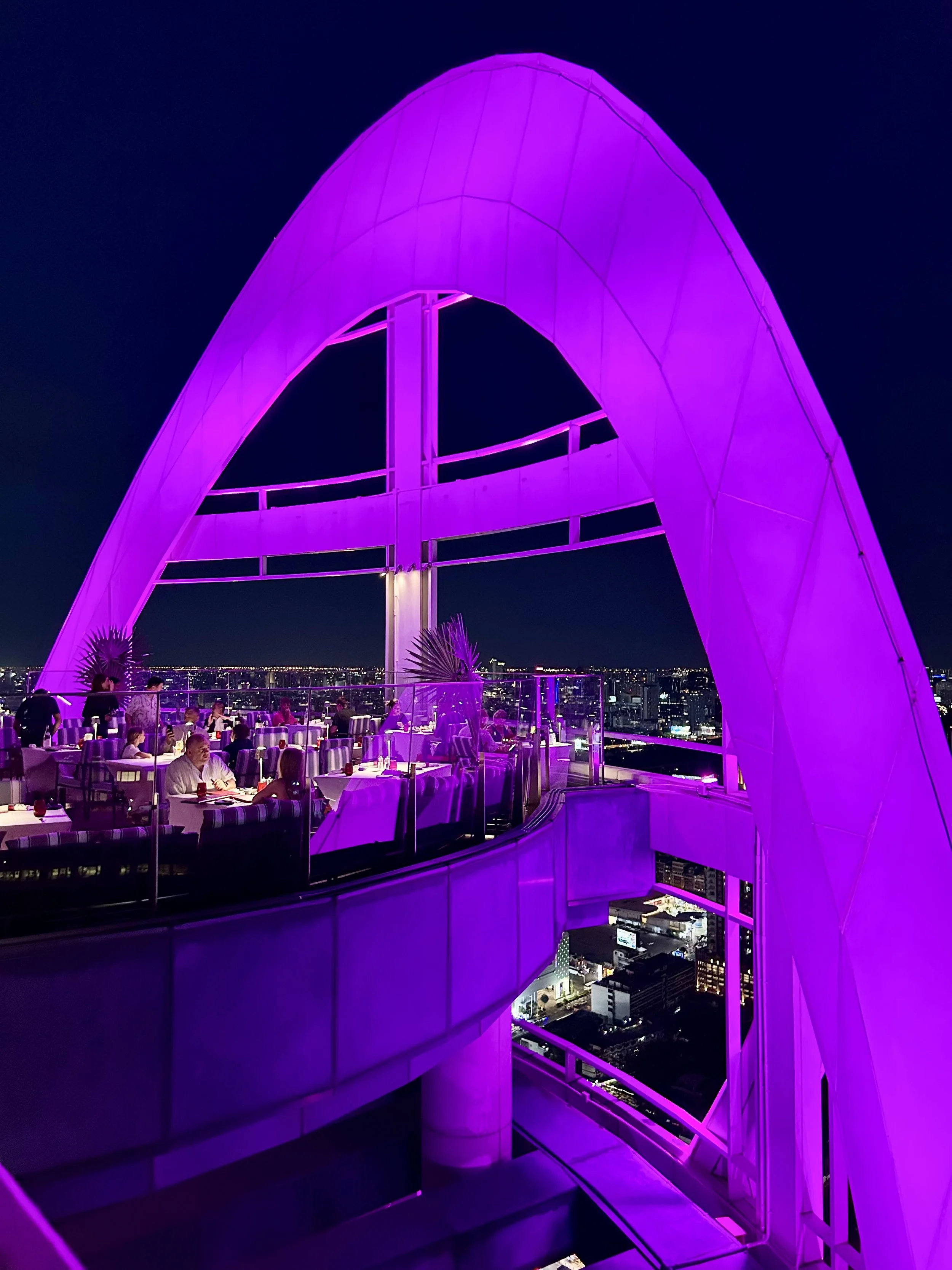 Överst på våning 55 ligger takbaren Red Sky som är en av mina favoritbarer i Bangkok. Extra plus är att barn också är välkomna här. Du kan både äta och dricka här och stället lyser upp av en jätestor båge som ändrar färg. Du kan också ta trappan upp till våning 56 där det finns en chamganebar men där får inte barn gå upp.